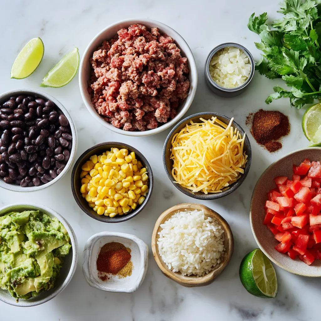 Gather these ingredients for a tasty Ground Beef Burrito Bowl. The beef adds rich flavor. Brown rice gives it a good base. Black beans provide protein and fiber. The veggies add color and nutrients. Each spice boosts the taste. Together, they create a dish that’s hearty and satisfying.