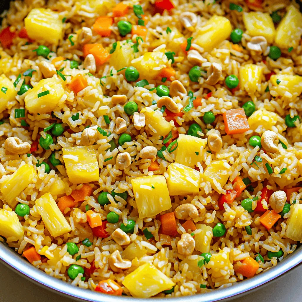 Each ingredient plays a key role in the dish. The cooked jasmine rice gives a fluffy base. The fresh pineapple adds sweetness and juiciness. Bell peppers bring color and crunch. Peas and carrots add a mix of flavors. Green onions provide a fresh finish. Garlic gives a lovely aroma. Soy sauce and sesame oil boost the umami. Ground ginger adds warmth, while black pepper gives a hint of spice. If you like crunch, add cashews or macadamia nuts.