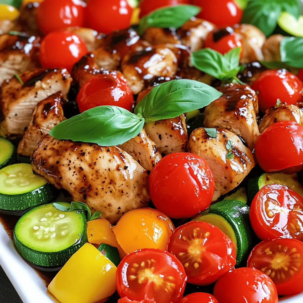 This recipe uses fresh chicken and colorful veggies. The marinade adds great flavor. Balsamic vinegar gives a sweet and tangy taste. Olive oil helps with cooking and adds richness. Honey balances the acidity. Make sure to use fresh garlic and herbs for the best results. You can add other veggies if you like. Try carrots, broccoli, or asparagus. They cook well and taste great. For a fresh touch, add basil leaves before serving. This dish is not just tasty but also healthy.