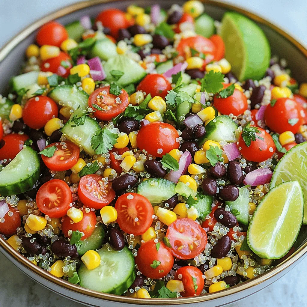 These ingredients create a vibrant and colorful salad. Quinoa adds protein and fiber. The beans boost the protein even more. Fresh veggies bring crunch and flavor.