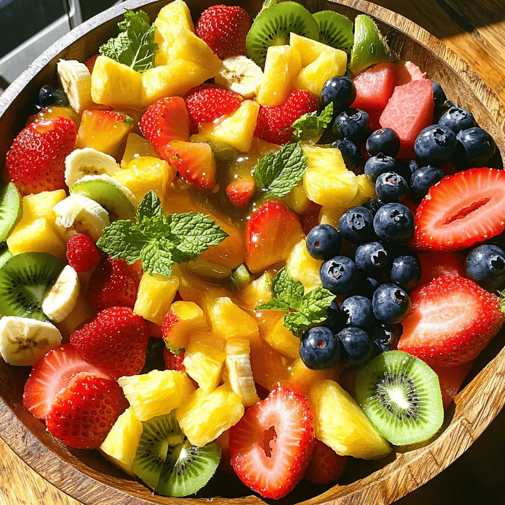 When I make Honey Lime Fruit Salad, I love to use fresh, vibrant fruits. Here’s what you’ll need: - Strawberries - Blueberries - Pineapple - Kiwi - Watermelon - Banana These fruits mix well together. They bring different colors and flavors to the dish. Strawberries and blueberries add sweetness. Pineapple gives it a tropical twist, while kiwi and watermelon add a juicy crunch. Finally, banana adds a creamy texture. For the dressing, you will need three simple ingredients: - Honey - Fresh lime juice - Lime zest I mix honey with lime juice and zest. This dressing adds a bright, tangy flavor. It balances the sweetness of the fruits. You can adjust the honey for your taste. For a special touch, consider adding: - Fresh mint leaves Mint leaves bring a fresh aroma. They also make the salad look beautiful. You can sprinkle them on top right before serving. For the full recipe, check out the detailed instructions. Enjoy making this refreshing salad! To start, wash your fruits well. Clean strawberries, blueberries, pineapple, kiwi, watermelon, and banana. Use a gentle touch with berries to avoid bruising. For the strawberries, hull them and cut them in half. Dice the pineapple into small pieces. Peel and slice the kiwi. Cube the watermelon and slice the banana. Once your fruits are ready, combine them in a large bowl. Make sure to mix them gently to keep the shapes intact. Next, we will make the honey lime dressing. In a small bowl, whisk together three tablespoons of honey, two tablespoons of fresh lime juice, and the zest of one lime. Whisk until the mixture is smooth and well combined. This step adds a bright, sweet flavor to the salad. Now, it’s time to bring it all together. Drizzle the honey lime dressing over your mixed fruit. Use a spatula to gently toss the fruit. Ensure each piece gets coated with the dressing. Let the salad sit for about ten minutes. This allows the flavors to meld and creates a refreshing dish. Serve the fruit salad in individual bowls or on a large platter. Don't forget to garnish it with fresh mint leaves for an extra pop of color and flavor. Enjoy your delicious creation! When choosing fruit for your salad, look for ripe and seasonal options. Ripe fruit tastes better and has more flavor. Seasonal fruit is often fresher and cheaper, too. I like to use a variety of colors in my salad. Bright red strawberries, deep blue blueberries, and sunny yellow pineapple create a feast for the eyes. This mix makes the dish fun and inviting. To adjust the sweetness, you can add more honey if you prefer. If it’s too sweet, squeeze in more lime juice for a nice balance. If you want a honey alternative, try maple syrup or agave nectar. These options work well and still taste great in your fruit salad. Serve your fruit salad cold for the best taste. Chill it in the fridge for a bit before serving. For a fun presentation, use clear cups or jars. Layer the fruit and dressing for a colorful look. Add fresh mint leaves on top for a pop of color and a hint of flavor. For the full recipe, check out the Honey Lime Fruit Salad! {{image_2}} You can swap out fruits in this salad. If you don't like a fruit, try a different one. Seasonal fruits can also be a great choice. For example, add peaches in summer or apples in fall. This keeps your salad fresh and fun. Always pick ripe fruits for the best taste. To make your salad more filling, add nuts or seeds. Chopped almonds or walnuts work great. They add crunch and nutrition. Another tasty option is yogurt. Pair your fruit salad with a scoop of Greek yogurt. It adds creaminess and extra protein. Add herbs or spices for a twist. Fresh mint or basil gives a nice flavor boost. A pinch of cinnamon can also add warmth. If you want to change the citrus, try orange juice instead of lime. This gives a sweet and tangy taste. You can mix and match to find your favorite flavors! For the full recipe, check out [Full Recipe]. To keep your honey lime fruit salad fresh, use airtight containers. Glass or plastic containers work well. Store the salad in the fridge right after serving. This keeps the fruit crisp and juicy. The salad lasts about 2 to 3 days in the fridge. After that, the fruit may get mushy. Freezing fruit salad isn't the best idea. The texture changes when fruit thaws. However, if you want to freeze it, prepare the salad without the honey-lime dressing. Place the fruit in a freezer-safe bag. Remove as much air as possible before sealing. To serve, thaw in the fridge overnight. Serve it fresh with the honey-lime dressing. You can make the fruit salad ahead of time. Prepare the fruit and place it in the fridge. This keeps it cool and fresh. Just add the honey-lime dressing right before serving. This way, the flavors stay bright. It’s a great way to save time. Enjoy a refreshing treat whenever you want! For the complete recipe, check out the Full Recipe. Yes, you can use different fruits in this salad. This recipe is very flexible. You can swap out strawberries for raspberries or blueberries for blackberries. Use your favorite fruits to create a mix you love. Seasonal fruits also work well. Try adding mango or peaches for extra sweetness. The salad lasts about 2 to 3 days in the fridge. To keep it fresh, store it in an airtight container. The fruits may start to lose their crunch after a day. So, enjoy it fresh for the best taste. If you need a honey substitute, try maple syrup or agave nectar. Both will add sweetness and work well with lime. If you want a sugar-free option, try stevia or monk fruit. Each option changes the flavor a bit, so choose what fits your taste. Yes, this fruit salad is very healthy. It is packed with vitamins and fiber from the fresh fruits. Strawberries and blueberries are great for your heart. Kiwi helps with digestion, while watermelon hydrates you. Plus, honey adds natural sweetness without refined sugar. Enjoy this salad as a snack or dessert! In this post, I shared a simple fruit salad recipe that dazzles any ta