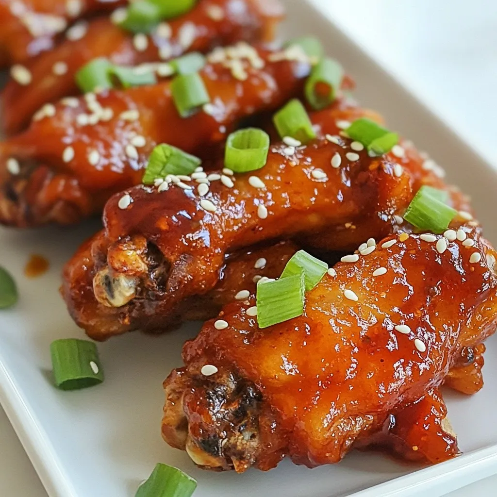 - 2 lbs chicken wings - 1/4 cup honey - 1/4 cup Sriracha sauce - 2 tablespoons soy sauce - 2 tablespoons unsalted butter, melted - 1 tablespoon apple cider vinegar - 1 clove garlic, minced - 1 teaspoon ginger, grated - 1/4 teaspoon black pepper - 1/4 teaspoon salt - Chopped green onions, for garnish - Sesame seeds, for garnish You can adjust the amount of honey and Sriracha to change the flavor. If you want less heat, use less Sriracha. For a sweeter taste, add more honey. You can swap soy sauce with tamari for a gluten-free option. If you don’t have apple cider vinegar, lemon juice works well too. Chopped green onions add a fresh taste and nice color. Sesame seeds give a crunchy texture and nutty flavor. You can also add a squeeze of lime for a zesty finish. These garnishes make the wings look great and enhance the flavor. {{ingredient_image_1}} Start by making the marinade. In a mixing bowl, combine these ingredients: - 1/4 cup honey - 1/4 cup Sriracha sauce - 2 tablespoons soy sauce - 2 tablespoons unsalted butter, melted - 1 tablespoon apple cider vinegar - 1 clove garlic, minced - 1 teaspoon ginger, grated - 1/4 teaspoon black pepper - 1/4 teaspoon salt Whisk these together until smooth. You want a nice blend of sweet and spicy. Now, it’s time to marinate the wings. Grab a large resealable plastic bag or a bowl. Place 2 lbs of chicken wings in it. Pour the marinade over the wings. Make sure every wing gets coated well. Seal the bag or cover the bowl and put it in the fridge. Let it sit for at least 1 hour. For the best taste, marinate overnight. When you’re ready to cook, preheat your oven to 400°F (200°C). Line a baking sheet with parchment paper. This helps with easy cleanup. Take the wings out of the marinade. Let any excess sauce drip off. Arrange the wings in a single layer on the baking sheet. Bake them for 25-30 minutes. Flip them halfway through for even cooking. If you want them extra crispy, switch to broil mode for the last 2-3 minutes. Watch them closely, so they don’t burn. After baking, take them out and brush with any leftover marinade. Let them rest for a few minutes. This helps them soak up all the great flavors. Now, they’re ready to serve. To change the heat of your Honey Sriracha Chicken Wings, you can adjust the Sriracha. If you want it milder, use less Sriracha sauce. You can also add more honey to balance the heat. For extra spice, add a pinch of cayenne pepper or more Sriracha. This way, you can make the wings fit your taste. Crispy wings are a must for game day. To get them crispy, use a parchment-lined baking sheet. Make sure the wings are in a single layer. Flip them halfway through cooking for even crispiness. For the last few minutes, switch to broil mode. Keep a close eye to avoid burning them. This will give you that perfect crunch. Marinating is key for great flavor. I recommend marinating your wings for at least one hour. For the best taste, let them sit overnight. This allows the flavors to soak in deeply. If you're short on time, even a quick 30 minutes will help. Remember, longer marinating means more flavor! Pro Tips Marinate Longer for Deeper Flavor: For the best flavor, marinate the wings overnight. This allows the flavors to penetrate the chicken more deeply. Adjust the Heat Level: Modify the amount of Sriracha based on your spice preference. You can also add a dash of cayenne pepper for extra heat. Use a Wire Rack: If you have one, place the wings on a wire rack over the baking sheet. This helps air circulate around the wings, making them crispier. Experiment with Garnishes: Try different garnishes like chopped cilantro or crushed peanuts for added flavor and texture. {{image_2}} You can switch up the sauce for your wings. Try using BBQ sauce for a smoky flavor. Teriyaki sauce adds a sweet touch. You might also like a garlic parmesan mix. Each sauce gives the wings a new twist. Experiment with your favorite flavors to find what you love most. You can cook these wings in different ways. The air fryer makes them crispy quickly. Set it to 375°F and cook for 25 minutes. Flip halfway for even cooking. Grilling adds a nice char. Preheat your grill and cook the wings for about 20 minutes. Turn them often for great results. Both methods keep the wings juicy and full of flavor. Pair these wings with tasty sides. Celery and carrot sticks add crunch. A cool ranch or blue cheese dip balances the heat. For a fun touch, serve with homemade fries or onion rings. You can even make a fresh salad for a lighter option. These sides will make your game day spread even better! After enjoying your Honey Sriracha chicken wings, store any leftovers in an airtight container. Keep them in the fridge. They will stay fresh for up to three days. Make sure the wings cool down before sealing them. This helps maintain their crispiness and flavor. To reheat your wings, the oven is your best friend. Preheat it to 350°F (175°C). Place the wings on a baking sheet. Heat them for about 10-15 minutes. This method keeps them crispy. You can also use a microwave, but this may make them less crunchy. If using the microwave, heat in short bursts to avoid overcooking. If you want to save wings for later, freezing is a great option. Let the wings cool completely. Place them in a freezer-safe bag, and remove as much air as possible. They can last up to three months in the freezer. When you're ready to eat them, thaw in the fridge overnight. Then, reheat them in the oven for the best results. To make your wings less spicy, reduce the Sriracha sauce. You can use only 2 tablespoons instead of 1/4 cup. Adding extra honey also helps balance the heat. Honey adds sweetness and mellows the spice. You could mix in a bit of ketchup, too, for more sweetness. This way, you still enjoy that great flavor without too much heat. Yes, you can use other cuts like drumsticks or chicken breasts. Just adjust the cooking time based on the size. Drumsticks work well since they are juicy and flavo