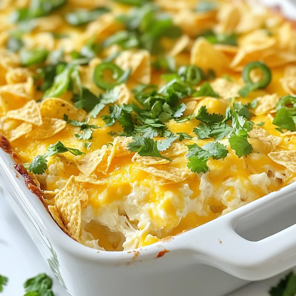 A creamy and cheesy casserole featuring shredded chicken, jalapeños, and topped with crunchy tortilla chips.