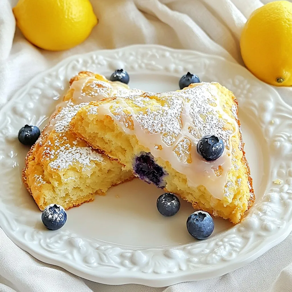 - 2 cups all-purpose flour - 1/2 cup sugar - 2 teaspoons baking powder - 1/2 teaspoon baking soda - 1/4 teaspoon salt - 1/2 cup unsalted butter, chilled and cubed - 1 cup fresh blueberries - Zest of 1 lemon - 1/4 cup freshly squeezed lemon juice - 1/2 cup heavy cream - 1 large egg - 1 teaspoon vanilla extract Choosing Fresh Blueberries Fresh blueberries make a big difference. Look for plump, firm berries. Avoid ones that are soft or mushy. They should be bright blue, with no green spots. Fresh berries give the best taste and color in your scones. Importance of Chilled Butter Chilled butter helps create flaky layers in your scones. When you mix it in, it should stay cold. This keeps the butter from melting too early. Use a pastry cutter or your fingers to cut it into the flour. This method helps form those lovely layers. Variations in Flour Types While all-purpose flour works best, you can experiment. Try whole wheat flour for a heartier texture. If you want a gluten-free option, use a gluten-free blend. Each type of flour will change the taste and texture slightly. Adjust your liquid if needed, as whole wheat absorbs more moisture. {{ingredient_image_1}} 1. Preheat your oven to 400°F (200°C). Line a baking sheet with parchment paper. 2. In a large bowl, mix the flour, sugar, baking powder, baking soda, and salt. Whisk them until they blend well. 3. Cut in the chilled butter. Use a pastry cutter or your fingers. The mix should look like coarse crumbs. 4. Gently fold in the blueberries and lemon zest. Make sure they are evenly spread in the mix. 5. In another bowl, whisk the lemon juice, heavy cream, egg, and vanilla extract. 6. Pour the wet mix into the dry ingredients. Stir gently until just combined. Don't overmix! 7. Move the dough to a floured surface. Knead it a few times, then pat it into a 1-inch thick circle. 8. Cut the circle into 8 wedges, or use a round cutter for individual scones. Place them on the baking sheet, leaving space between each. 9. Bake for 15-20 minutes, until golden brown at the edges. 10. Let the scones cool on a wire rack for a few minutes before serving. How to Achieve Golden Brown Edges To get those perfect golden edges, use a hot oven at 400°F. Make sure your baking sheet is lined with parchment paper. This helps the scones bake evenly. Watch them closely during the last few minutes. The edges should be light brown when ready. Avoiding Overmixing for Best Texture Mix the dough gently. Overmixing makes scones tough. Combine the wet and dry ingredients until just mixed. It's okay if there are some lumps. This keeps your scones light and fluffy. Dusting with Powdered Sugar After baking, dust the scones with powdered sugar. This adds a sweet touch and makes them look pretty. For a fun twist, you can add a simple lemon glaze. Just mix powdered sugar with lemon juice and drizzle it on top. Serving with Butter or Clotted Cream These scones taste wonderful with a spread of butter or clotted cream. The creaminess balances the tartness of the lemon. Serve them warm for the best flavor. Keeping Scones Fresh Store your scones in an airtight container at room temperature. This keeps them soft for a couple of days. If you want to keep them longer, consider freezing them. Freezing for Later Enjoyment To freeze, wrap each scone in plastic wrap. Then place them in a freezer bag. You can enjoy them later! Just thaw them at room temperature and warm in the oven for a few minutes to refresh their taste. Pro Tips Use Cold Ingredients: Ensure your butter and cream are chilled to create a flaky texture in the scones. Don't Overmix: Mix until just combined to avoid tough scones; a few lumps are okay! Fresh Blueberries: Use fresh blueberries for the best flavor; frozen can make the dough too wet. Brush with Cream: For a golden-brown finish, brush the tops of the scones with a bit of heavy cream before baking. {{image_2}} You can mix in other fruits for fun. Raspberries add a nice touch. Their tartness pairs well with the lemon. You can also try strawberries or blackberries. Each fruit brings its own flavor twist. Herbs can also spice things up. Adding fresh thyme gives a unique taste. It works well with the lemon and blueberries. Start with a teaspoon and adjust to your liking. If you need a gluten-free option, use almond flour. It makes the scones nutty and soft. You can also mix gluten-free flour blends. They work well with this recipe. Reducing sugar is another great choice. You can cut the sugar by half. The lemon and blueberries still provide sweetness. You can also use honey or maple syrup. Just adjust the liquid ingredients. Scone sandwiches are a fun way to serve them. Spread cream cheese or lemon curd between two scones. Add fresh fruit for a tasty twist. Pair your scones with tea or coffee. The flavors blend nicely. A nice Earl Grey tea or a dark roast coffee works well. Enjoy the flavors together for a delightful treat. You can store your freshly baked scones at room temperature. Place them in a container with a lid. This keeps them soft and tasty. If it’s very warm, put them in the fridge. The cold slows down spoilage. You can freeze your scones, either before or after baking. To freeze raw scones, cut and shape them. Place them on a baking sheet and freeze for about an hour. Once firm, wrap them well and store in a zip-top bag. For baked scones, let them cool first. Then wrap and store them the same way. When you are ready to enjoy the frozen scones, let them thaw in the fridge overnight. To reheat, bake them in a 350°F (175°C) oven for about 10 minutes. They will taste fresh again! Freshly baked scones last about 2 to 3 days at room temperature. If you store them in the fridge, they may last up to a week. Frozen scones keep well for about 2 to 3 months. For the best flavor and texture, enjoy them soon. What is the secret to fluffy scones? The secret is to use cold butter. This keeps the scone light. Cut the butter into the flour until it looks like crumbs. Don't