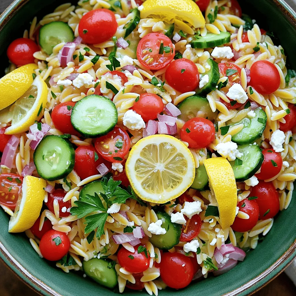 for more details. Start by boiling water in a large pot. Add salt to the water for flavor. Once it boils, add 1 cup of orzo pasta. Cook the orzo until it is al dente, about 8 to 10 minutes. Drain the orzo in a colander. Rinse it under cold water to stop cooking. This keeps the orzo firm and fresh. In a small bowl, combine the dressing ingredients. Whisk together 2 tablespoons of olive oil, 3 minced garlic cloves, the zest of 1 lemon, and the juice of that lemon. Add salt and pepper to taste. If you like spice, include 1/2 teaspoon of red pepper flakes. This dressing gives the salad a bright and zesty flavor. In a large mixing bowl, add the cooked orzo. Next, mix in halved cherry tomatoes, diced cucumber, and finely chopped red onion. Add 1/4 cup of fresh chopped parsley for a burst of color. Stir everything gently to combine. Be careful not to mash the ingredients. Pour the lemon garlic dressing over the salad mixture. Toss everything gently until well-coated. If you want, sprinkle 1/4 cup of crumbled feta cheese on top. This adds creaminess. Taste the salad and adjust seasoning if needed. Serve the salad in a large bowl. Garnish with lemon slices and a sprig of parsley for a fresh look. Enjoy it chilled or at room temperature. You can find the full recipe for Lemon Garlic Orzo Salad in the earlier section. To cook orzo just right, start with a large pot of boiling salted water. Add the orzo and stir a bit. Cook it according to the package instructions until it is al dente, which means it should have a tiny bite. Drain the orzo well and rinse it under cold water. This helps cool it down and stops the cooking process. To make a great dressing, use fresh ingredients. I like to whisk together olive oil, minced garlic, lemon zest, and lemon juice in a small bowl. This combo brings out bright flavors. Add salt and pepper, too. If you like some heat, a pinch of red pepper flakes works well. Pour this dressing over your salad just before serving for the best taste. You can boost the flavor of your Lemon Garlic Orzo Salad by adding fresh herbs. Try mixing in chopped parsley, basil, or dill. These herbs add freshness and aroma. For a nice crunch, include diced cucumber and halved cherry tomatoes. If you want creaminess, crumbled feta cheese is a great addition. Each bite should be a mix of textures and flavors. For the full recipe, check out the details above! {{image_2}} You can swap ingredients based on the season. In summer, try adding fresh basil or arugula. In fall, roasted sweet potatoes or butternut squash work well. Use seasonal produce to boost flavor and cut costs. To make this salad vegan, skip the feta cheese. You can add avocado for creaminess. For gluten-free options, replace orzo with quinoa or rice. Both choices keep the salad hearty and delicious. You can change the flavor profile easily. Add fresh mint for a refreshing twist. A pinch of cumin or smoked paprika can create a warm flavor. Experiment with your favorite herbs to create unique tastes. For the full recipe, check the earlier sections. To keep your Lemon Garlic Orzo Salad fresh, place the leftovers in an airtight container. This helps keep the flavors intact and prevents drying out. Make sure to cool the salad to room temperature before sealing it up. If you have extra dressing, store it separately to avoid soggy orzo. Reheating this salad is easy. However, I recommend enjoying it cold or at room temperature for the best taste. If you prefer it warm, gently heat it in a pan on low. Stir it often to warm it evenly without cooking it further. In the refrigerator, your Lemon Garlic Orzo Salad lasts about 3 to 5 days. Be sure to check for any signs of spoilage before eating. If the salad starts to smell off or looks strange, it's best to toss it. The fresher the salad, the better it tastes, so enjoy it soon after making! For the full recipe, refer back to the notes above. If you can’t find orzo, try using rice or quinoa. Both have a nice texture. You can also use small pasta shapes like ditalini or couscous. They all mix well with the salad. This salad stays fresh for about three days in the fridge. Store it in an airtight container. The flavors will blend, making it even tastier over time. Yes, you can make this salad a day in advance. Just keep the dressing separate until serving. This keeps the veggies crisp and fresh. Absolutely! This Lemon Garlic Orzo Salad is great for meal prep. You can portion it out for lunches. Just remember to store the dressing separately. You can add protein easily! Grilled chicken, shrimp, or chickpeas work well. This makes the salad more filling and adds extra flavor. In this blog post, we covered the vital steps to make a fresh Lemon Garlic Orzo Salad. We explored key ingredients, cooking methods, and tips for flavor. I shared helpful tricks for perfecting orzo and ways to adjust the recipe for your needs. Remember, fresh ingredients can boost taste. Storing leftovers properly keeps them tasty longer. You can adapt this dish to suit any diet or preference. Try it out, and enjoy your delicious creation!](https://juliesdish.com/wp-content/uploads/2025/06/a30f2aa3-13e0-4e39-ba41-a010b61df71d-768x768.webp)