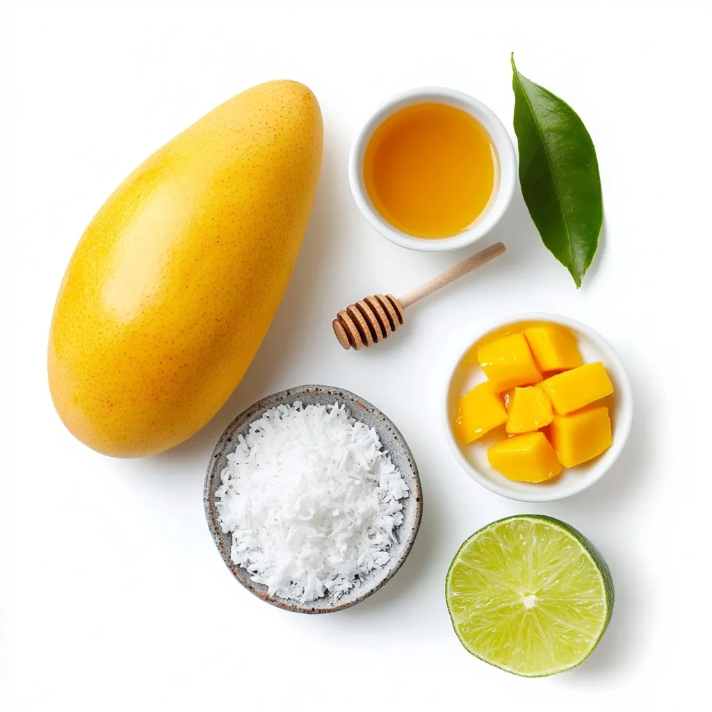 First, gather your ingredients. You need ripe mangoes, coconut milk, honey or agave syrup, lime juice, salt, and shredded coconut.