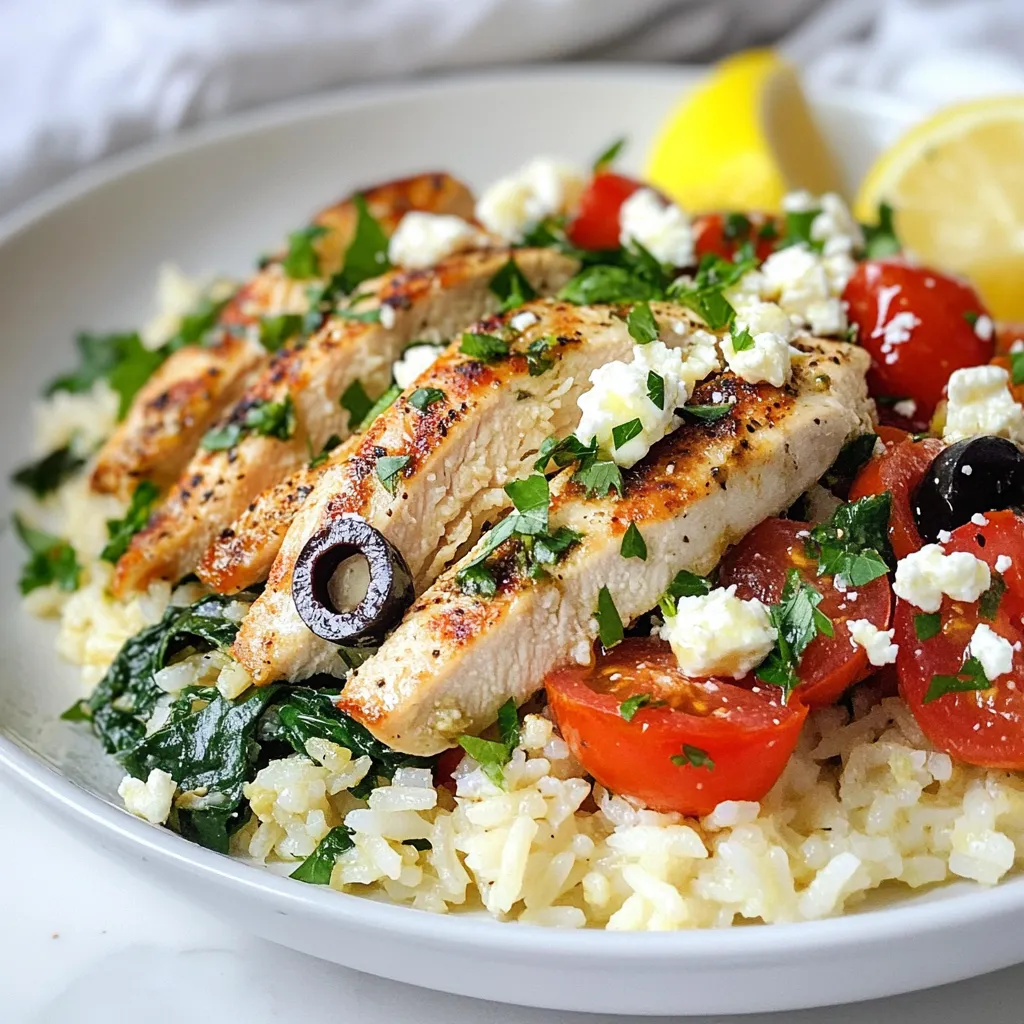Now it’s time to bring everything together. Add the cooked rice to the skillet with the tomato and spinach. Drizzle with fresh lemon juice. Mix in the sliced olives and crumbled feta cheese. Stir until well combined. Place the sliced chicken on top for a beautiful finish.