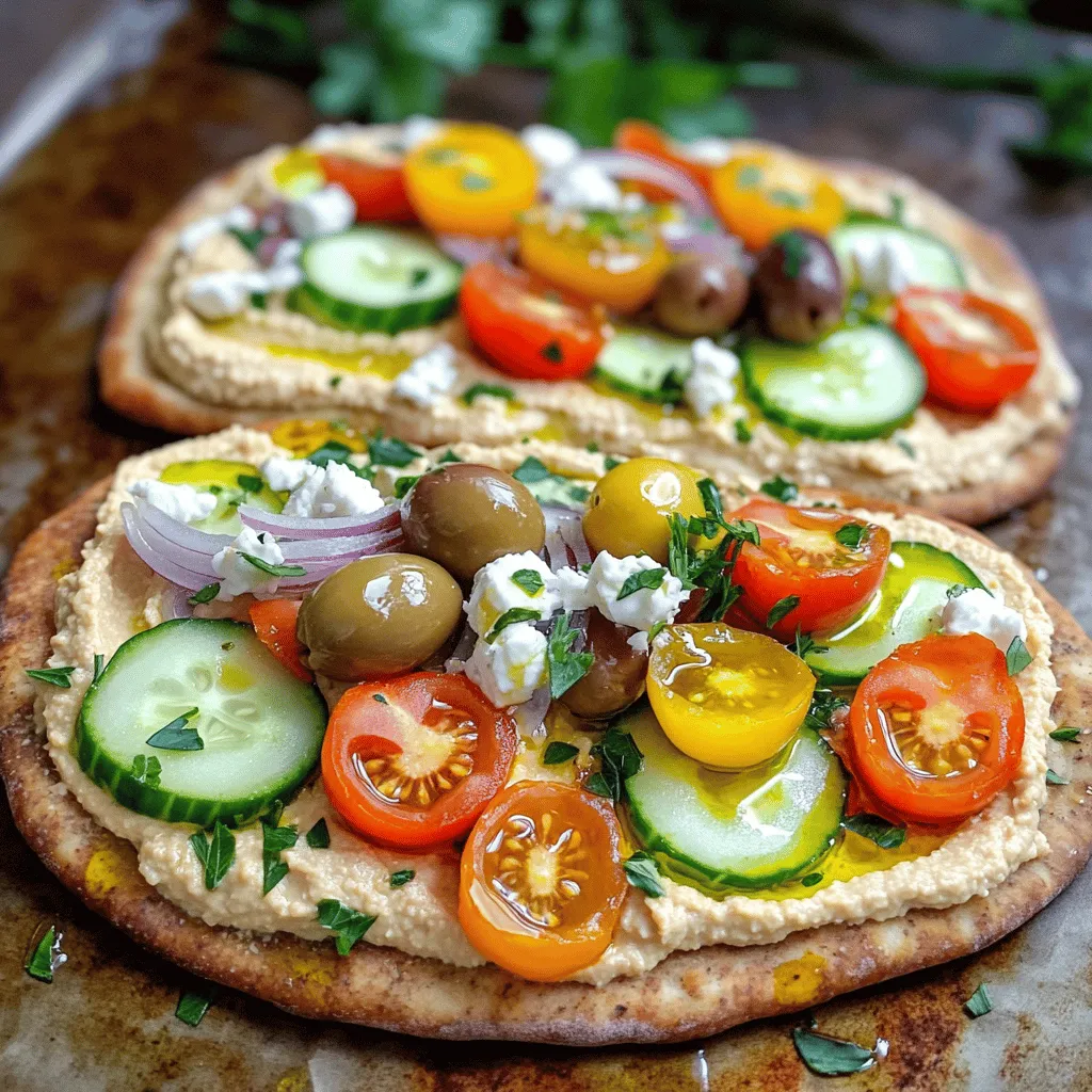 ![To make the perfect Mediterranean flatbread pizza, gather your ingredients. Each one plays a key role in creating a tasty dish. Here’s what you need: - Whole wheat flatbreads - Hummus (store-bought or homemade) - Fresh vegetables and toppings - Seasonings and garnishes Whole wheat flatbreads serve as the base. They give a nice, hearty flavor. You can find them in most grocery stores. If you prefer, you can also make your own. Hummus is the creamy layer on top. You can use store-bought or make your own. Homemade hummus is simple and fun to make. Just blend chickpeas, tahini, lemon juice, and garlic. Fresh vegetables add color and crunch. Use cherry tomatoes, cucumbers, red onions, and Kalamata olives. These bright veggies bring great taste and nutrition. Seasonings make your flatbread pizza shine. I like to use olive oil, dried oregano, salt, and pepper. Fresh parsley adds a nice touch too. It boosts flavor and looks great on top. With these ingredients, you’re ready to create a delicious Mediterranean flatbread pizza. For the full recipe, check out the [Full Recipe]. First, set your oven to 400°F (200°C). This heat makes the flatbread crispy. While the oven warms up, take a baking sheet. Line it with parchment paper. This keeps the flatbreads from sticking. Place the flatbreads on the sheet. Make sure they are flat and ready for toppings. Start by spreading the hummus. Use a spoon to cover each flatbread. Leave a small edge around the sides. Next, add the toppings. Place halved cherry tomatoes, cucumber slices, and red onion on the hummus. Make sure to spread them evenly. Now, sprinkle sliced Kalamata olives and crumbled feta cheese on top. This adds flavor and texture. Drizzle olive oil over everything. Finish with dried oregano, salt, and pepper. Put the baking sheet in the oven. Bake for 12 to 15 minutes. Look for crispy, golden edges. When done, take it out and let it cool slightly. Garnish with fresh parsley to add color. Use a sharp knife to slice the flatbreads into wedges. Serve them warm to enjoy the flavors. For the full recipe, check out the instructions above. To get a crispy base, start with a hot oven. Preheat your oven to 400°F (200°C). This high temperature helps the flatbread crisp up quickly. Also, use thin flatbreads. Thick flatbreads can turn chewy. A thinner base will bake faster and become crunchy. When choosing toppings, think about color and taste. Cherry tomatoes add sweetness. Cucumbers give a nice crunch. Kalamata olives bring a salty bite. Feta cheese adds creaminess. You can also try roasted red peppers or artichokes for new flavors. Balance is key. Mix soft and crunchy ingredients for a great texture. One big mistake is overloading your flatbread. Too many toppings can make it soggy. Stick to a few tasty options. Also, don't forget seasoning. A sprinkle of salt and pepper can boost flavors. If you skip this step, your pizza may taste flat. Keep it simple and tasty! {{image_2}} You can make this pizza vegetarian by using plant-based toppings. Try artichokes, bell peppers, or spinach. These ingredients add color and flavor. For a vegan version, swap out feta cheese for a dairy-free alternative. Cashew cheese or vegan feta works well. This way, everyone can enjoy the pizza! Want more protein? Adding grilled chicken or shrimp boosts flavor and nutrition. You can also use different cheeses. Goat cheese or mozzarella melts beautifully. They add a creamy texture that complements the veggies. Feel free to get creative and mix cuisines! Try adding pesto sauce for a fresh twist. You can also swap olives with capers for a salty kick. This keeps the dish exciting and unique. Each bite can be a new adventure! If you want the full recipe, check it out [here](#). To keep your Mediterranean flatbread pizza fresh, store it properly. First, let it cool to room temperature. Then, wrap each piece tightly in plastic wrap or foil. You can also place it in an airtight container. This stops air from getting to the pizza. You can store it in the fridge for up to three days. If you want to keep it longer, freeze it. Wrap the pizza well and place it in the freezer. Frozen flatbread pizza can last up to two months. When it's time to enjoy your leftovers, reheating is key. The best way to reheat is in the oven. Preheat your oven to 375°F (190°C). Place the pizza on a baking sheet and cover it with foil. This helps keep it warm and moist. Bake for about 10-15 minutes. If you want a crispy crust, remove the foil for the last few minutes. You can also use an air fryer. Set it to 350°F (175°C) and heat for about 5-7 minutes. This method keeps the pizza crispy and delicious. To make hummus, you need just a few simple ingredients. You will need: - 1 can of chickpeas, drained and rinsed - 1/4 cup tahini - 2 tablespoons olive oil - 1 lemon, juiced - 1 garlic clove, minced - Salt to taste - Water (as needed) Start by blending the chickpeas, tahini, olive oil, lemon juice, and garlic in a food processor. Blend until smooth. If it seems too thick, add water a little at a time. Taste and add salt to your liking. This hummus is creamy and perfect for your flatbread pizza. Yes, you can use store-bought flatbreads! Look for brands that use whole wheat or other healthy grains. Some quality brands include Joseph’s, Stonefire, or even local bakeries. Always check the ingredient list for added sugars or preservatives. Using good flatbreads will enhance your pizza. Mediterranean ingredients are great for your health. They often include fresh veggies, whole grains, and healthy fats. Here are some key benefits: - Olive oil: Rich in healthy fats, it helps lower heart disease risk. - Vegetables: Low in calories and high in vitamins, they boost nutrition. - Feta cheese: A source of protein and calcium, it adds flavor without too many calories. - Olives: Full of antioxidants, they support overall health. Eating these ingredients can lead to better heart health and lower weight. You can find Medit