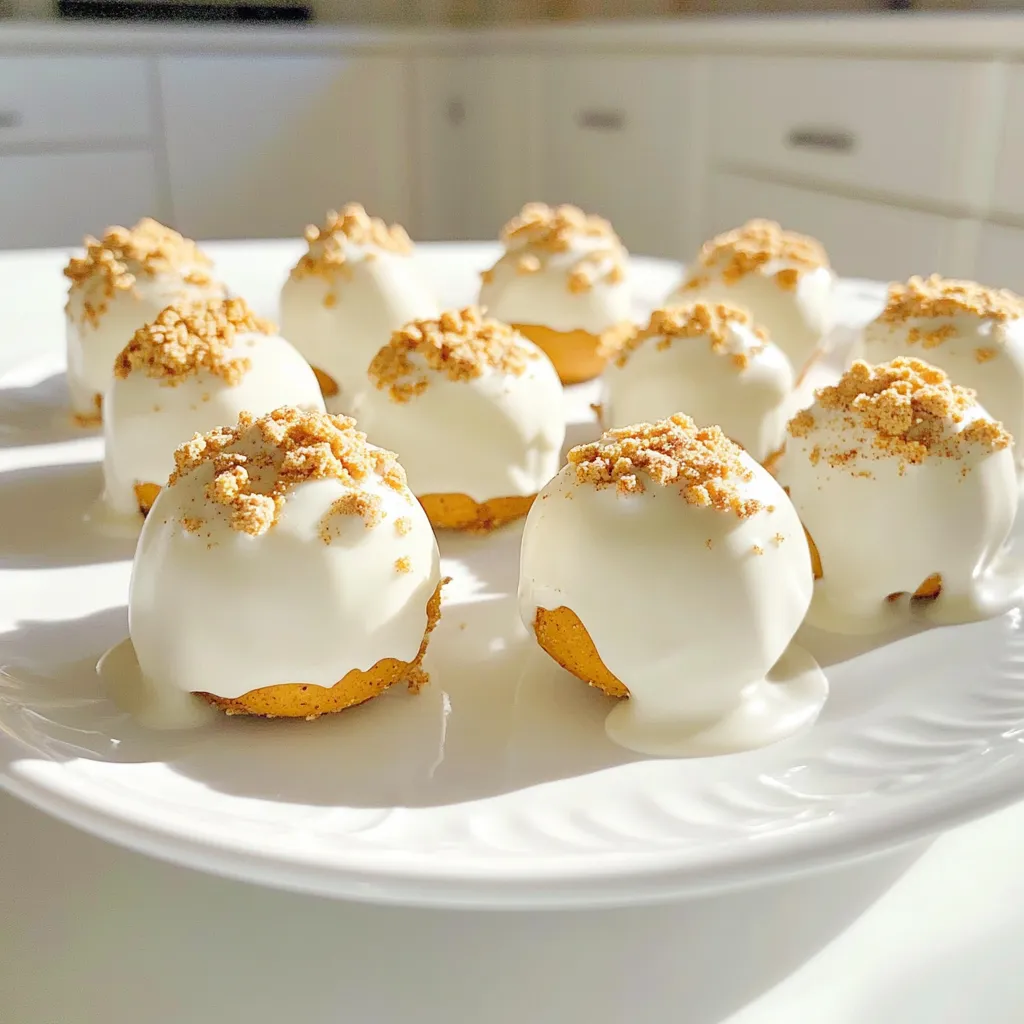Now, take each pumpkin bite and dip it into the melted white chocolate. Make sure to coat each bite fully. After that, return the bites to the baking sheet. While the chocolate is still warm, sprinkle crushed graham crackers on top. This adds a nice crunch. Finally, let the tray chill in the fridge for about 30 minutes. This helps the white chocolate set well.