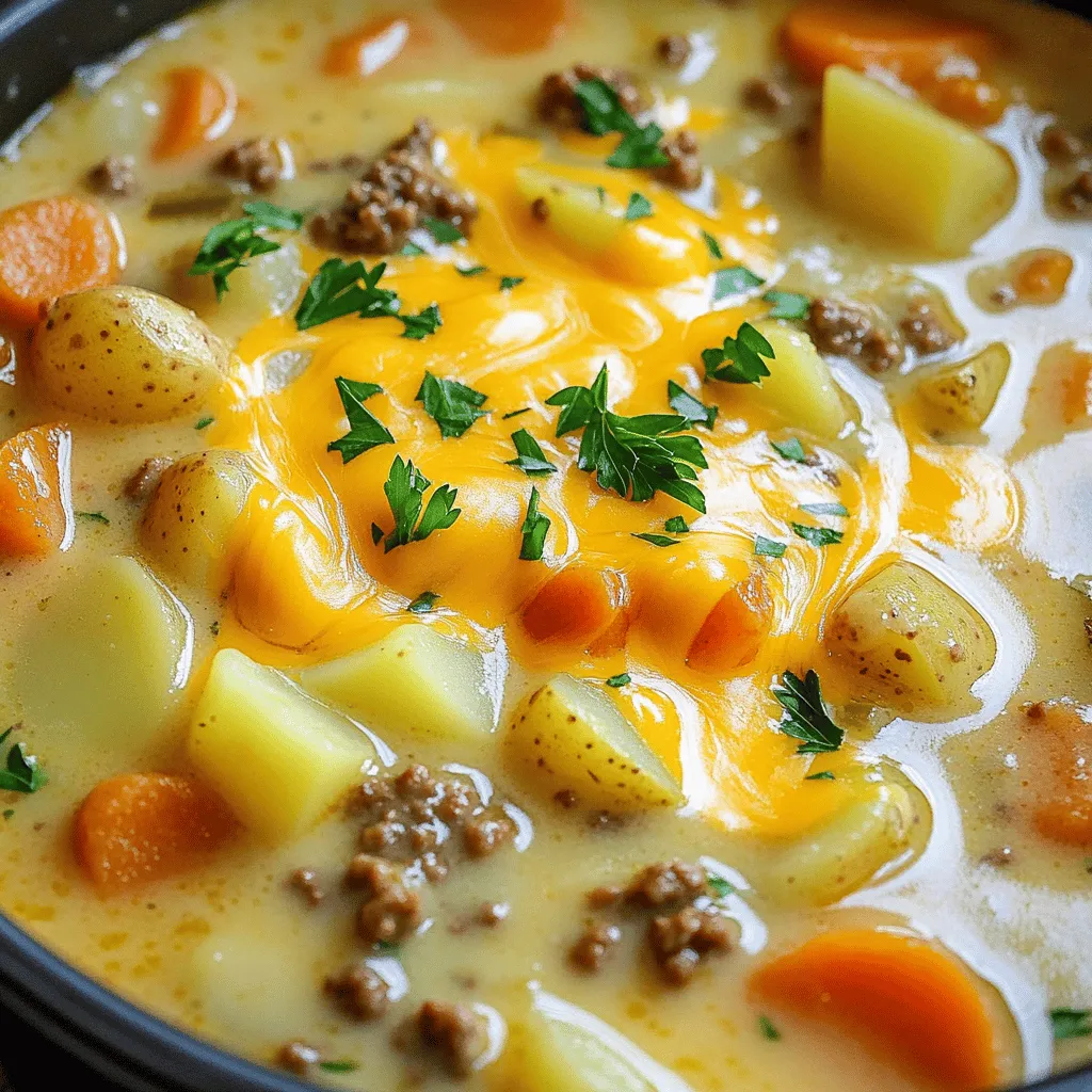 ![To make this hearty soup, you will need the following key ingredients: - 1 lb ground beef (or ground turkey for a lean option) - 1 medium onion, diced - 2 cloves garlic, minced - 3 medium potatoes, diced - 4 cups beef broth - 1 cup carrots, diced - 1 cup celery, diced - 1 teaspoon Italian seasoning - 1 tablespoon Worcestershire sauce - Salt and pepper to taste - 1 cup cheddar cheese, shredded - 1 tablespoon olive oil - 1/2 cup heavy cream (optional for creaminess) - Fresh parsley for garnish These ingredients work together to create a warm, filling meal. The ground beef adds protein, while the veggies give texture and flavor. The broth brings everything together, making it a true comfort food. While the base recipe is delicious, you can add extra flavors with these optional ingredients: - Crispy bacon bits for a smoky touch - Hot sauce for heat - Bell peppers for sweetness and crunch - Fresh herbs like thyme or dill for freshness Feel free to mix and match! These extras can elevate your soup and make it your own. Here’s a breakdown of the nutritional benefits of the main ingredients: - Ground beef: Rich in protein and iron, helps build muscles. - Onions: Packed with vitamins and antioxidants, great for heart health. - Garlic: Boosts the immune system and adds flavor. - Potatoes: A good source of carbs and fiber, keeps you full. - Carrots and celery: High in vitamins and add crunch. - Cheddar cheese: Provides calcium and makes the soup creamy. - Heavy cream: Adds richness but can be left out for a lighter meal. Using these ingredients, you can enjoy a nutritious meal that fills you up and warms your heart. If you want the full recipe, check it out! To make One-Pot Cheeseburger Soup, start by gathering your ingredients: - 1 lb ground beef (or ground turkey for a lean option) - 1 medium onion, diced - 2 cloves garlic, minced - 3 medium potatoes, diced - 4 cups beef broth - 1 cup carrots, diced - 1 cup celery, diced - 1 teaspoon Italian seasoning - 1 tablespoon Worcestershire sauce - Salt and pepper to taste - 1 cup cheddar cheese, shredded - 1 tablespoon olive oil - 1/2 cup heavy cream (optional for creaminess) - Fresh parsley for garnish Cooking steps: 1. In a large pot, heat the olive oil over medium heat. Add the diced onion and minced garlic. Sauté until the onion turns translucent, about 3-4 minutes. 2. Next, add the ground beef (or turkey) to the pot. Cook until it browns, breaking it up with a spoon as it cooks. This takes around 5-7 minutes. Drain any excess fat if needed. 3. Stir in the diced potatoes, carrots, and celery, mixing well with the meat and onions. 4. Pour in the beef broth. Add Italian seasoning, Worcestershire sauce, salt, and pepper. Bring this mixture to a boil. Once boiling, reduce the heat and let it simmer for about 20 minutes, until the potatoes and carrots are tender. 5. If you want a creamier soup, stir in the heavy cream. Then add the shredded cheddar cheese. Stir until the cheese melts and everything combines well. 6. Taste your soup and adjust the seasoning if needed. 7. Serve hot. Garnish with fresh parsley on top for a pop of color. - Use fresh ingredients: Fresh veggies and herbs make a big difference in taste. - Don’t rush: Allow the soup to simmer fully for the best flavors to develop. - Adjust to taste: Always taste your soup before serving. Add more salt or pepper if needed. - Cheese choice: Use high-quality cheddar for the best melt and flavor. This simple and quick process makes the One-Pot Cheeseburger Soup a great choice for busy days. You can find the full recipe linked for more details. To make your soup creamier, add heavy cream when you finish cooking. This adds a rich flavor and smooth texture. You can also use cream cheese for a different taste. Blend it smooth before adding it to the pot. If you want a lighter option, use half-and-half. It still gives a creamy feel without too many calories. Reheating this soup is easy and quick. Use a pot over medium heat for best results. Stir often to keep it smooth. You can also use a microwave for quick reheating. Just cover the bowl to avoid spills. Heat in short bursts, stirring in between. This keeps the soup from getting too hot or thick. You can easily customize this recipe for various diets. If you're vegetarian, use plant-based ground meat or lentils. Swap beef broth for vegetable broth to keep it veggie-friendly. For a low-carb option, replace potatoes with cauliflower. This makes the soup lighter but still filling. For lactose-free needs, try dairy-free cheese and coconut milk. These swaps keep the flavor while fitting your diet. For the full recipe, check out the details above. {{image_2}} You can easily adapt this recipe to make it vegetarian. Instead of beef, use plant-based ground meat. You can also add beans for protein and fiber. Mushrooms give a nice, meaty texture, too. Use vegetable broth instead of beef broth for the soup base. This will keep the flavors rich without using meat. You can follow the full recipe, making these easy swaps. If you like heat, add some spice! You can mix in jalapeños or chili powder to the pot. Hot sauce is another great choice; stir it in when you add the cheese. Pepper jack cheese is an excellent substitute for cheddar. It adds creaminess and a nice kick. Adjust the spice level to suit your taste. This twist will give your soup an exciting flavor boost. For a low-carb version, skip the potatoes. Use cauliflower instead; it gives a similar texture. You can also add zucchini or spinach for more veggies. Use a low-carb broth and keep the cheese for flavor. Heavy cream is still a great option here, adding richness without the carbs. This way, you get all the deliciousness without the extra carbs. Enjoy this healthy take on cheeseburger soup! After enjoying your delicious one-pot cheeseburger soup, store leftovers quickly. Let the soup cool down to room temperature. Pour it into an airtight container. This helps keep the soup fresh. Store it in the fri