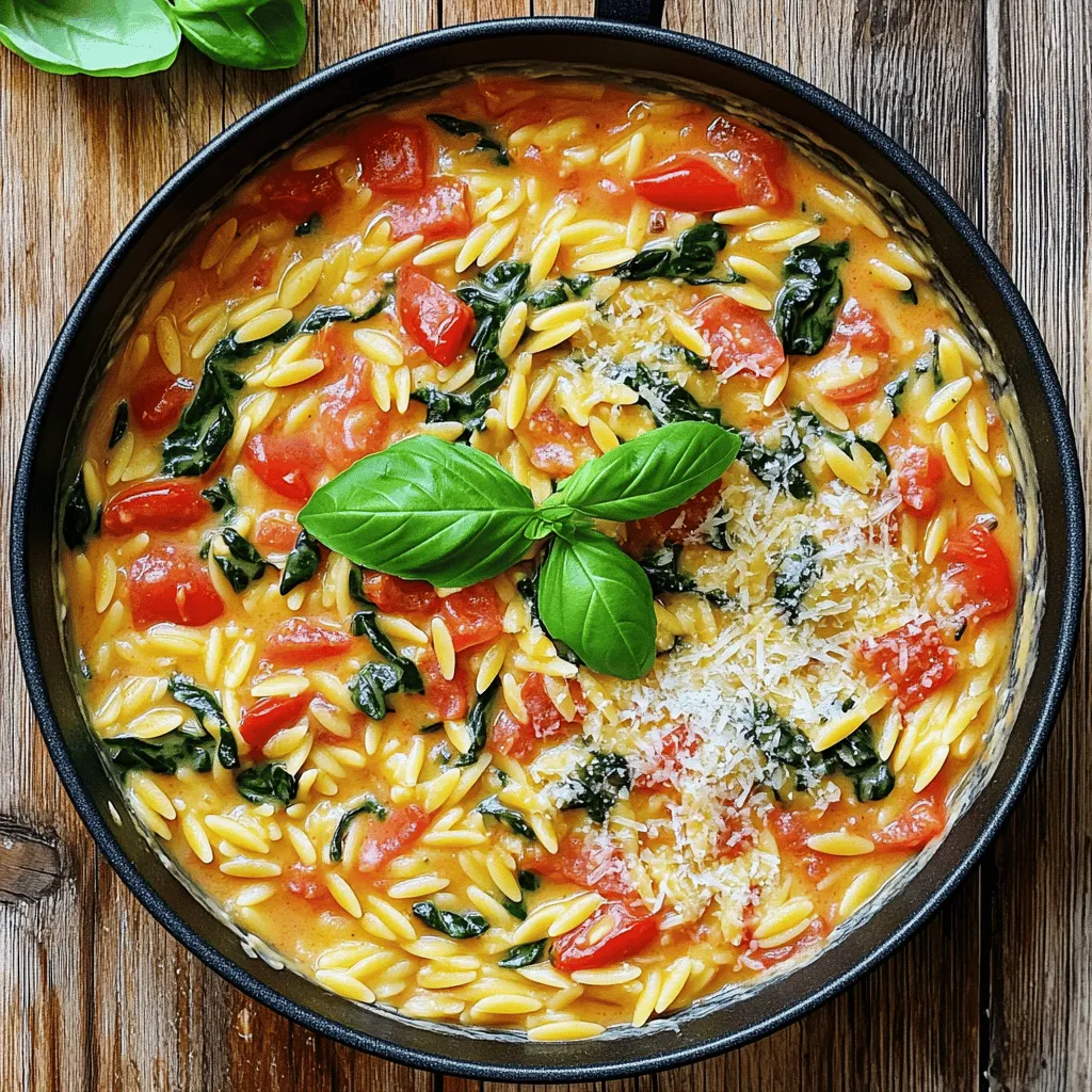 To make One Pot Creamy Tomato Spinach Orzo, you need the following: