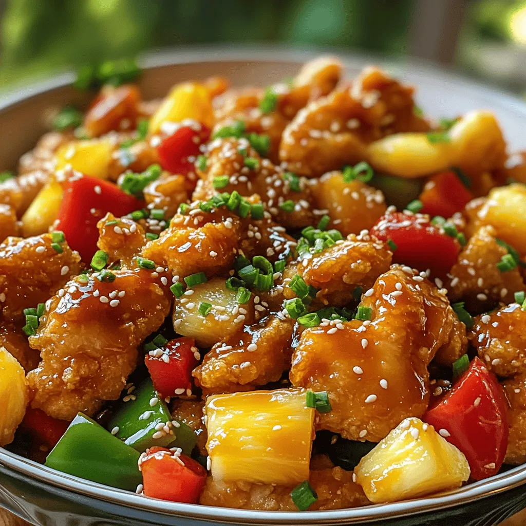 - 1 lb boneless, skinless chicken thighs - 1 cup cornstarch - 1 egg, beaten - 1/2 cup all-purpose flour - 1/2 cup pineapple chunks - 1 red bell pepper, diced - 1 green bell pepper, diced - 1/2 cup red onion, diced - 3 green onions, chopped (for garnish) - 1/2 cup honey - 1/4 cup soy sauce - 1/4 cup rice vinegar - 1 tablespoon sriracha - 1 teaspoon garlic powder - 1 teaspoon ginger powder - 1 tablespoon cornstarch mixed with 2 tablespoons water (slurry) To make this Panda Express Sweet Fire Chicken Copycat dish, start with fresh ingredients. Using boneless chicken thighs gives the best flavor. The cornstarch helps create a crispy outer layer. This contrasts nicely with the sweet and spicy sauce. You can adjust the sriracha if you want more or less heat. For the veggies, I love adding pineapple. It brings a nice sweetness. The red and green peppers add crunch and color. Don’t forget the onions for extra flavor. The green onions on top make it look pretty and add a fresh taste. The sweet fire sauce is the star. It combines honey and soy sauce for a sweet-savory mix. Rice vinegar adds tang. The garlic and ginger powder give depth. When you stir in the cornstarch and water slurry, it thickens quickly. This makes the sauce cling to the chicken and veggies perfectly. Check the [Full Recipe] for detailed instructions and tips to make this dish shine! - Mix cornstarch and flour in a bowl. - Coat each chicken piece in beaten egg. - Roll the chicken in the cornstarch-flour mix until fully covered. - Heat oil in a deep skillet over medium-high heat. - Carefully add chicken pieces in batches. - Fry them until they turn golden brown, about 4-5 minutes. - Remove the fried chicken and let it drain on paper towels. - In a saucepan, combine honey, soy sauce, rice vinegar, sriracha, garlic powder, and ginger powder. - Heat the mixture over medium heat, stirring well. - Once it simmers, add the cornstarch slurry to thicken the sauce. - Stir continuously for about 2-3 minutes until thickened. - If needed, add more oil to the skillet. - Stir-fry diced red and green bell peppers, onion, and pineapple chunks for 3-4 minutes. - Cook until the vegetables start to soften, but stay crisp. - Add the fried chicken back into the skillet with the vegetables. - Pour the sweet fire sauce over the mix and toss well. - Make sure everything is coated and heated through before serving. For the complete dish, follow the [Full Recipe]. - Avoid overcrowding the frying pan. This helps the chicken fry evenly. If you put in too much, the oil cools down. That leads to soggy chicken. - Ensure the oil is at the right temperature. Use a thermometer if you have one. The oil should be around 350°F. This keeps the chicken crispy and golden. - Tips for customizing sriracha amount: Start with one tablespoon. Taste the sauce. If you want more heat, add a little more. Remember, it's easier to add than to take away! - Alternatives for milder sauce: Swap sriracha for a mild chili sauce or omit it. You can also use sweet chili sauce for a different flavor. - Suggestions for garnishing: Use chopped green onions and sesame seeds. They add color and crunch. You can also add fresh cilantro for a pop of green. - Plating ideas for a restaurant-style look: Serve the chicken on a white plate. Arrange the chicken and veggies in a neat pile. Drizzle some sauce over the top for a glossy finish. {{image_2}} You can make a baked version of Sweet Fire Chicken. This keeps it crispy without frying. Use lean chicken breast instead of thighs. Chicken breast has less fat and works well. Bake the chicken at 400°F for 20-25 minutes. This way, you keep the flavor and save some calories. For a meat-free dish, use plant-based substitutes. Tofu or tempeh can replace chicken. Both soak up flavors well. For the sauce, replace honey with agave syrup. Use soy sauce, rice vinegar, and sriracha as usual. This keeps the taste while making it vegan-friendly. Sweet Fire Chicken pairs great with rice or noodles. The sauce soaks into rice nicely. You can also add sides like steamed veggies or a fresh salad. This creates a balanced meal and adds color to your plate. Enjoy your cooking! To store leftovers, let the Sweet Fire Chicken cool. Place it in a sealed container. Keep it in the refrigerator for up to three days. To maximize shelf life, store the chicken and sauce separately. This helps keep the chicken crispy for a longer time. When you are ready to eat, just heat them together. You can freeze the Sweet Fire Chicken for up to three months. Place it in an airtight container or freezer bag. Make sure to remove as much air as possible. To reheat, thaw overnight in the fridge. Then, bake it in the oven for the best texture. This keeps the chicken crispy and juicy. You can also use the microwave. Just heat on low power, stirring often, until hot. Yes, you can make Sweet Fire Chicken ahead of time. I suggest preparing the chicken and sauce in advance. Store the cooked chicken and sauce separately in the fridge. When you are ready to eat, just heat them up. This way, you keep the chicken crispy. It only takes about 10 minutes to reheat. Yes, you can make this recipe gluten-free. Use tamari instead of soy sauce. For the breading, replace all-purpose flour with a gluten-free flour blend. You can also use cornstarch to coat the chicken. These swaps keep the taste similar while making it safe for gluten-free diets. To thicken the sauce, add more cornstarch. Mix a tablespoon of cornstarch with two tablespoons of water to make a slurry. Stir this into the sauce as it simmers. Keep stirring until it thickens. You can also let the sauce cook a bit longer to reduce it. Sweet Fire Chicken pairs well with many sides. Here are some popular options: - Steamed white rice - Fried rice with veggies - Noodles, like chow mein - A fresh green salad - Stir-fried broccoli or snap peas These sides add balance and make a complete meal. For the full recipe, check out the Sweet Fire Chicken Delight. Th