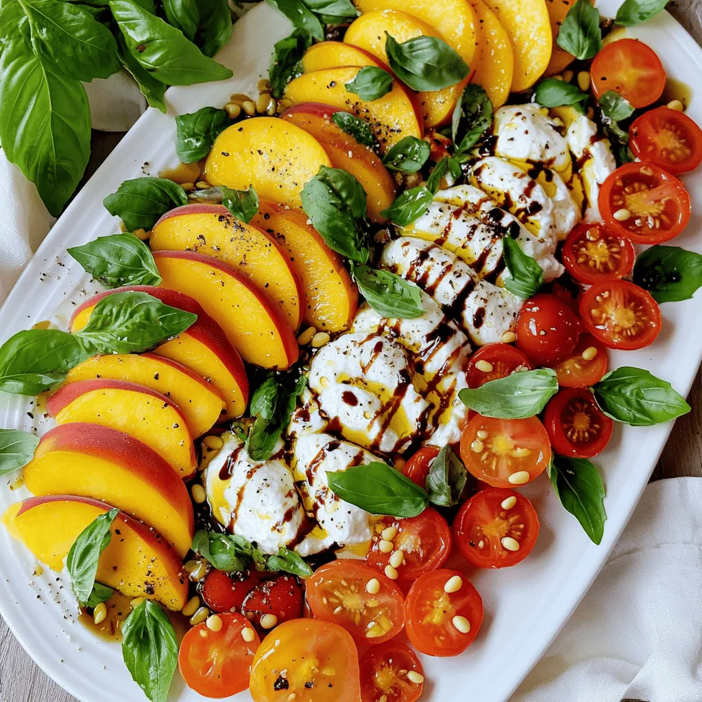 - 2 ripe peaches, sliced - 8 ounces fresh burrata cheese - 2 cups cherry tomatoes, halved - 1 cup fresh basil leaves - 3 tablespoons balsamic glaze - 2 tablespoons extra-virgin olive oil - Salt and pepper to taste - 1/4 cup toasted pine nuts (optional) This salad shines with a few simple, fresh ingredients. The peaches offer a sweet touch, while burrata adds creaminess. Cherry tomatoes bring a burst of flavor, and basil gives a fragrant lift. Balsamic glaze and olive oil tie everything together with a tasty drizzle. Salt and pepper add the finishing touch. - Alternative cheeses: You can use mozzarella or feta cheese as a substitute for burrata. Both add unique flavors. - Seasonal fruit options: Try using ripe figs or nectarines in place of peaches for a different taste. - Different types of balsamic glaze: If you don’t have balsamic glaze, regular balsamic vinegar works well. Just drizzle a little more for sweetness. You can find the Full Recipe for the Peach Burrata Caprese Salad to guide you through the delicious steps! First, wash the peaches and cherry tomatoes well under cold water. This step ensures they are clean and fresh. Next, slice the peaches into thin wedges. Also, halve the cherry tomatoes. This helps in creating a nice mix of flavors and textures. Now, grab a large platter. Arrange the peach slices evenly, fanning them out. This will create a beautiful base for your salad. Now it’s time to layer the salad. Take the burrata cheese and tear it into pieces. Place these gently on top of the peach slices. This cheese adds a creamy texture that pairs well with the sweet peaches. Then, scatter the halved cherry tomatoes around the burrata and peaches. This adds vibrant color and a burst of flavor. Finally, tear the fresh basil leaves. Sprinkle them over the salad for a fragrant touch. Next, drizzle the extra-virgin olive oil over the entire salad. This adds richness and depth. Follow this by adding balsamic glaze. This adds a sweet tang that complements the peaches and cheese. Finally, season the salad with salt and pepper to taste. Adjust this according to your preference. If you want an extra crunch, sprinkle toasted pine nuts on top. This simple step enhances flavor and adds texture. For the complete method, refer to the Full Recipe. When selecting peaches, look for ones that are soft but not mushy. A ripe peach should yield slightly when you press it. Here are some tips for choosing the best fruit: - Choose peaches with a vibrant color. - Smell the peach; a sweet aroma means it's ripe. - Avoid peaches with blemishes or dark spots. I recommend using yellow peaches for their sweet flavor. White peaches are also good if you want something sweeter and juicier. Burrata cheese adds creaminess to your salad. To serve it right, tear the burrata gently with your hands. Use a sharp knife for clean cuts if needed. Here are some tips for keeping it fresh: - Store burrata in its liquid to keep it moist. - Keep it in the fridge and use it within a few days for the best taste. To make your salad shine, balance the flavors well. Sweet peaches and creamy burrata work great together. Here are some tips to achieve that balance: - Use fresh basil for a fragrant touch. - Drizzle balsamic glaze to add sweetness and acidity. - Season with salt and pepper to enhance the flavors. Feel free to add spices like crushed red pepper for a kick or even some toasted pine nuts for crunch. Check out the Full Recipe for all the details! {{image_2}} You can switch up flavors based on the season. In fall, try adding figs or apples. They bring a sweet and earthy taste that pairs well with the salad. In summer, add peppery arugula or fresh mint for a cool twist. These greens brighten the dish and add extra crunch. If you want a vegan option, replace burrata with cashew cheese or tofu. They mimic the creamy texture without dairy. For gluten-free and dairy-free versions, ensure your balsamic glaze is gluten-free. You can also skip the pine nuts to avoid nuts if needed. This salad shines next to grilled chicken or shrimp. The light flavors balance well with protein. For drinks, try a crisp white wine or sparkling lemonade. Both drinks enhance the fresh taste of the salad. Each bite feels like a summer day! For the Full Recipe, check the ingredients and cooking steps to bring this salad to life! To keep your Peach Burrata Caprese Salad fresh, store it in an airtight container. Make sure to cover it well to prevent air from spoiling the flavors. The salad stays good in the fridge for up to two days. After that, the peaches might get mushy, and the cheese will lose its creaminess. You can prepare parts of the salad ahead of time. Slice the peaches and tomatoes a few hours before serving. However, keep the burrata separate until you're ready to eat. This helps maintain its creamy texture. For the best flavor, store the salad components in separate containers. It helps keep everything fresh and tasty when you mix them right before serving. Freezing the entire salad is not a great idea. The peaches and burrata do not freeze well and will lose their texture. You can freeze sliced peaches if you want to use them later. Just wash and slice them first, then place them in a freezer bag. For burrata, I don’t recommend freezing it, as it will become watery when thawed. Enjoy this salad fresh for the best taste! For the full recipe, check out the linked section above. To ripen peaches, place them in a paper bag. This method traps the ethylene gas they emit. Keep them at room temperature for a few days. Check daily until they feel soft to the touch. You can also place them near bananas for quicker ripening. Yes, you can prepare parts of the salad ahead. Slice the peaches and tomatoes, but keep them separate. Burrata is best added just before serving. This way, it stays fresh and creamy. Make the salad right before you eat it for the best flavor. Burrata cheese offers several health benefits. It is rich in calcium, which suppor