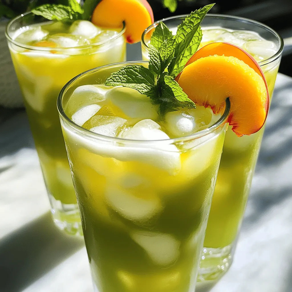 ![- Green tea bags - Ripe peaches - Honey or other sweeteners - Lemon juice - Fresh mint for garnish Peach iced green tea is both tasty and simple. Each ingredient plays a key role in flavor. - Green tea bags: Use high-quality green tea bags. They offer a fresh taste and health benefits. Green tea is rich in antioxidants. - Ripe peaches: Choose sweet, ripe peaches. They add a fruity flavor and natural sweetness. Look for peaches that are slightly soft. - Honey or other sweeteners: Honey is my favorite, but you can use any sweetener. Adjust the amount to suit your taste. - Lemon juice: Fresh lemon juice brightens the drink. It adds a zesty kick that balances the sweetness. - Fresh mint for garnish: Mint gives a refreshing touch. It also adds a lovely aroma to your drink. - Large saucepan - Blender - Pitcher - Glasses for serving Having the right tools makes cooking easier. Here’s what you need to make this drink: - Large saucepan: This is for boiling water and steeping tea. It should hold enough water for your ingredients. - Blender: Use a blender to puree the peaches. It creates a smooth mixture that blends nicely with the tea. - Pitcher: A pitcher is perfect for mixing and serving the drink. It should be large enough to hold all the ingredients. - Glasses for serving: Choose your favorite glasses to serve this drink. Clear glasses show off the beautiful color. Now you have all the ingredients and tools. Get ready to make a delicious Peach Iced Green Tea! For the complete recipe, check out the [Full Recipe]. To start, boil 4 cups of water in a large saucepan. Bring it to a rolling boil. Once boiling, remove it from heat. This step is key to unlock the tea's flavor. Next, add the 4 green tea bags to the hot water. Let them steep for about 3-4 minutes. This time gives you a nice balance of taste. If you want stronger tea, steep a bit longer. When finished, remove the tea bags and let the tea cool to room temperature. Now, let’s focus on the peaches. First, take 2 ripe peaches. Cut them in half and remove the pit. Slice the peaches into smaller pieces for easy blending. Place the sliced peaches into a blender. Blend until smooth, aiming for a puree-like consistency. If it seems too thick, add a splash of water to help it blend. This peach puree will add natural sweetness and flavor to your drink. In a large pitcher, combine the cooled green tea and peach puree. Add in 1/4 cup of honey, or adjust to your taste. Pour in 1 tablespoon of lemon juice for a tangy kick. Stir the mixture well. Make sure the honey dissolves completely. This helps ensure even flavor throughout your drink. Once mixed, you’re ready to serve your refreshing peach iced green tea! To make the best peach iced green tea, start with sweetness. You can adjust the honey. Add more for sweeter tea or less for a mild taste. I love using ripe peaches, as they add great flavor. If the tea is too sweet, add more lemon juice. It gives a nice balance. To enhance peach flavor, blend the peaches well. A smooth puree works best. You can also try using peach juice. Just mix it into the tea. This adds a lovely peachy kick. The right glassware can make a big difference. I recommend tall glasses. They show off the pretty color and look great on a table. Use clear glasses to highlight the peach puree. For the best taste, serve the tea cold. Use plenty of ice cubes to keep it chilled. If it sits too long, it can lose its freshness. So, enjoy it right away for the best flavor. Garnishing adds flair to your drink. Fresh mint leaves are a perfect choice. They bring a cooling effect and look nice. You can also try basil for a different twist. Adding fruit slices makes it special. Use extra peach slices or even lemon. Place them on the rim of your glass. This not only looks good but also adds great taste. For the full recipe, please refer to the Full Recipe section. {{image_2}} You can change the sweetener in your peach iced green tea. Natural sweeteners, like agave or maple syrup, work well and add unique flavors. These options are often healthier than regular sugar. They can give your drink a nice twist. For low-calorie choices, try stevia or monk fruit sweetener. They help keep sugar levels low while still tasting sweet. Want to mix things up? Add fresh herbs like basil or thyme. These herbs give the tea a refreshing taste. You can also infuse your tea with extra fruits. Think berries, citrus, or pineapple! Each fruit adds its own flavor and makes your drink more exciting. You can make a warm version of peach green tea, too. Just steep the tea bags in hot water without ice. This version is cozy and perfect for cooler days. Drinking warm peach green tea has benefits. It can soothe your throat and help with digestion. Plus, the warm drink can bring out the peach flavor. Try these variations to find your favorite way to enjoy peach iced green tea. For a full recipe and more tips, check out the [Full Recipe]. To keep your peach iced green tea fresh, use a glass or plastic pitcher with a lid. This prevents the tea from absorbing other smells in the fridge. If you do not have a pitcher, a mason jar works well too. Store the tea in the fridge for up to 3 days. After that, the flavor may fade, and it might taste less fresh. Make sure to check for any signs of spoilage before drinking. Yes, leftover peach puree can be reused! You can mix it into yogurt, oatmeal, or smoothies. It adds a nice fruity flavor and boosts nutrition. For the tea bags, you can reuse them for a second brew. Just steep them in hot water for a shorter time. You may notice the flavor is lighter, but it's still tasty. You can swap out honey for other sweeteners. Here are some great options: - Agave syrup - Maple syrup - Stevia - Coconut sugar Each sweetener has its own taste. If you use agave, start with less. Maple syrup is richer but adds depth. Stevia is low-calorie, so use it carefully. Taste as you go to find your sweet spot. Peach iced green tea is tasty and healthy. Here 