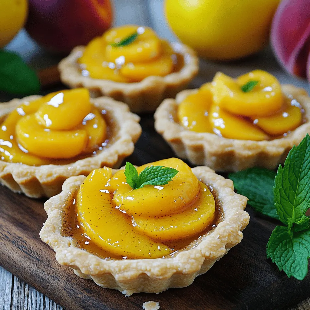 Peach tartlets are a simple yet delightful treat. You only need a few basic ingredients. This recipe yields six tartlets. You can enjoy them warm or cool. Here’s what you need to make peach tartlets: - 1 cup all-purpose flour - 1/4 cup unsalted butter, softened - 1/4 cup granulated sugar - 1/4 teaspoon salt - 1/4 teaspoon vanilla extract - 1 tablespoon cold water - 2 ripe peaches, pitted and sliced - 1 tablespoon brown sugar - 1 teaspoon cinnamon - 1 tablespoon cornstarch - 1 tablespoon lemon juice - Fresh mint leaves for garnish (optional) Each ingredient plays a key role. The flour forms the crust, while peaches give the tartlets their sweet flavor. You can swap some ingredients if needed. Here are a few ideas: - Use whole wheat flour instead of all-purpose flour for a nuttier taste. - Coconut oil can replace unsalted butter for a dairy-free option. - For sweetness, try honey or maple syrup in place of granulated sugar. - Use any favorite fruit if peaches aren’t available. Apples or berries work well too. These substitutions can help you customize the tartlets to your taste or dietary needs. Enjoy experimenting! Start by preheating your oven to 375°F (190°C). This step gets your oven ready for baking. In a bowl, mix together the flour, softened butter, granulated sugar, salt, and vanilla extract. You want a crumbly texture. Then, add cold water one tablespoon at a time. Mix until the dough sticks together. Next, divide the dough into small balls. Press each ball into mini tartlet pans. Make sure to cover the bottom and sides well. Now, let’s prepare the filling. In another bowl, mix the sliced peaches, brown sugar, cinnamon, cornstarch, and lemon juice. Toss gently to coat the peaches. This helps the flavors blend nicely. Once your tartlet crusts are ready, spoon the peach mixture into each one. Fill them evenly. Place the tartlets in the oven and bake for 20-25 minutes. You want the crust to turn golden and the peaches to bubble. Keep an eye on them to avoid burning. After baking, take the tartlets out of the oven. Let them cool for a few minutes. This makes them easier to remove from the pans. Once cool, you can gently lift them out. For a nice touch, add fresh mint leaves on top before serving. These tartlets are great warm or at room temperature. Enjoy your Peach Tartlets Delight with friends or family! For the full recipe, check out the complete guide. To get a great crust, keep your butter cold. This helps the crust stay flaky. Mix the flour and butter until it looks like crumbs. Don’t overwork the dough. Just bring it together gently. Press it into the tartlet pans firmly. This makes sure it holds its shape while baking. Choose ripe peaches for the best flavor. Look for peaches that are soft but not mushy. Their skin should be smooth and fragrant. If you can, smell them; a sweet aroma means they are ripe. If you can’t find ripe peaches, let them sit at room temperature for a day or two. They will sweeten up nicely. Make sure your oven is fully preheated. This helps the tartlets cook evenly. Place the tartlet pans on the middle rack. This avoids hot spots in the oven. Check them at the 20-minute mark. If they are golden brown and bubbly, they are ready. If not, give them a few more minutes. Enjoy the smell that fills your kitchen as they bake. For more details, you can see the Full Recipe. {{image_2}} You can make gluten-free peach tartlets easily. Use gluten-free flour instead of all-purpose flour. This swap keeps the crust light and tasty. Make sure to check the flour blend for a good texture. You might need more cold water to bind the dough. To create vegan peach tartlets, swap butter with coconut oil or a vegan butter. Replace the egg with a tablespoon of ground flaxseed mixed with water. This mix helps bind the tartlets well. The result is a sweet and fruity dessert that everyone can enjoy. You can add fun flavors to your tartlets. Consider using nutmeg for warmth and spice. A few drops of almond extract can bring a lovely nutty taste. You can also try mixing in some fresh lemon zest for a bright, citrus note. These little extras can make your tartlets even more special. For the full recipe, check the earlier section. Enjoy experimenting with these variations! Store leftover peach tartlets in an airtight container. Keep them in the fridge. They stay fresh for about three days. If you want them to last longer, freezing is a better option. To freeze peach tartlets, let them cool completely after baking. Then, wrap each tartlet in plastic wrap. Place them in a sealable freezer bag. Label the bag with the date. Frozen tartlets keep well for about one month. When you are ready to enjoy them, thaw in the fridge overnight. Reheat peach tartlets in the oven for the best results. Preheat your oven to 350°F (175°C). Place the tartlets on a baking sheet. Heat for about 10 minutes. This helps keep the crust crispy and the filling warm. You can also use a microwave, but the tartlets may lose their crispness. For a quick heat, microwave for about 20-30 seconds. Enjoy your delicious treat! You can tell when your peach tartlets are done by looking at the crust. It should be golden brown. The peaches will also bubble a bit. If you see this, they are ready. You can use a toothpick to check the crust. Insert it into the edge. If it comes out clean, the tartlets are done. Yes, you can use other fruits! Berries like blueberries or raspberries work great. Apples and pears can also be tasty. Just make sure to adjust the sugar. Some fruits are sweeter than peaches. You want to keep the filling balanced. Try mixing fruits for a fun twist! Serve these tartlets warm or at room temperature. A scoop of vanilla ice cream adds a nice touch. You can also top them with whipped cream. Fresh mint leaves make a pretty garnish too. For a fancy look, drizzle some caramel sauce on top. Get creative and enjoy! We explored how to make peach tartlets, from key ingredients to baking tips. You learned ab