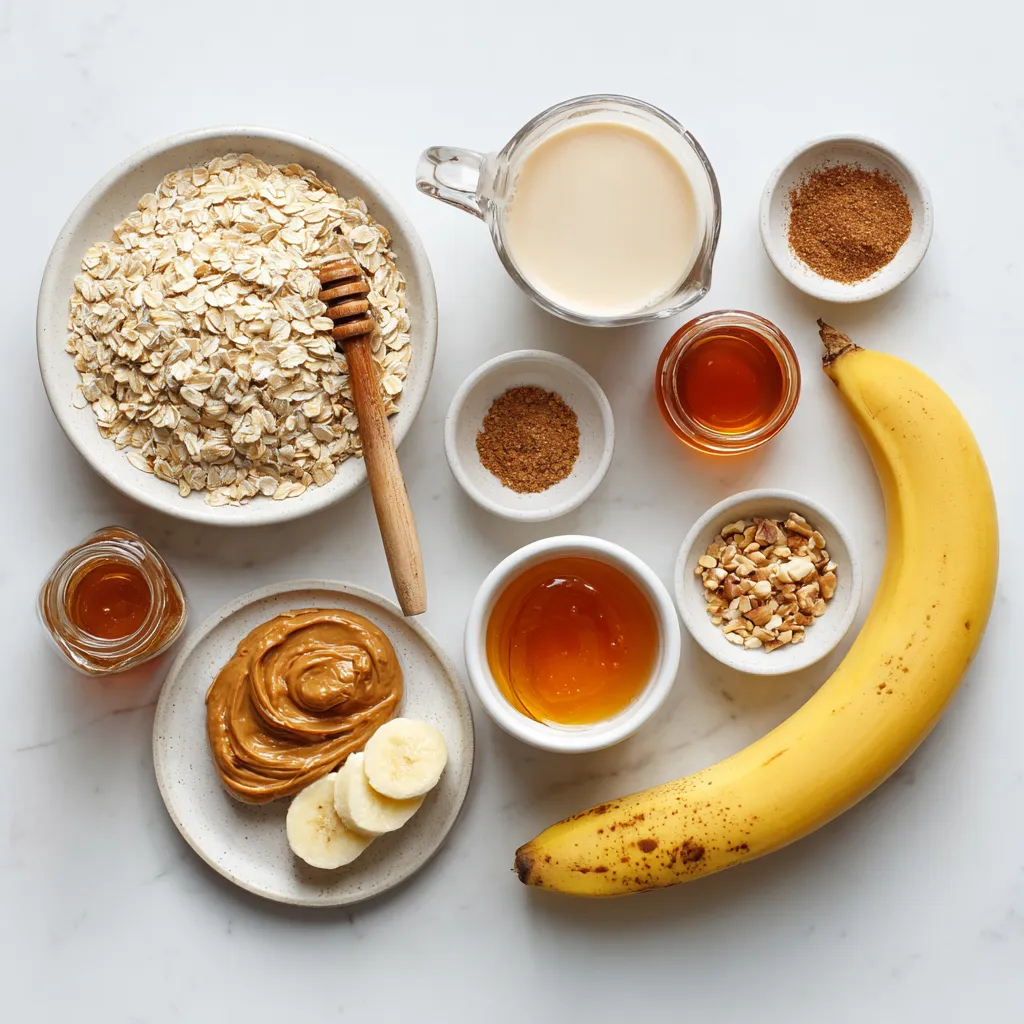 Gather these ingredients to make peanut butter banana overnight oats. Each item plays a key role. Rolled oats form the base, soaking up all the flavors. Almond milk adds creaminess, while bananas give natural sweetness. Creamy peanut butter brings richness and protein.