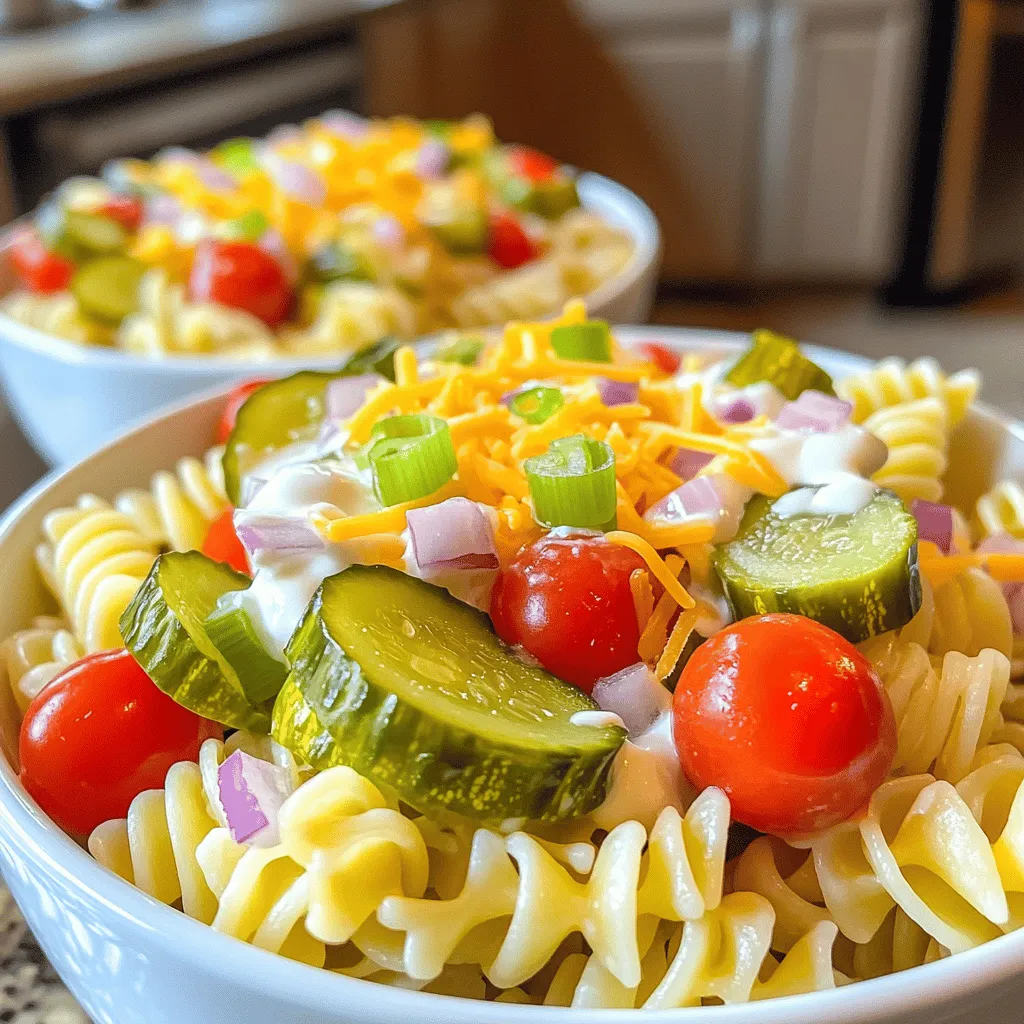 Dill pickles work best for this recipe. Their tangy flavor balances the creaminess of the ranch dressing. You can also try bread and butter pickles for a sweeter taste. Just remember to chop them into small pieces. This helps them blend in well with the pasta.