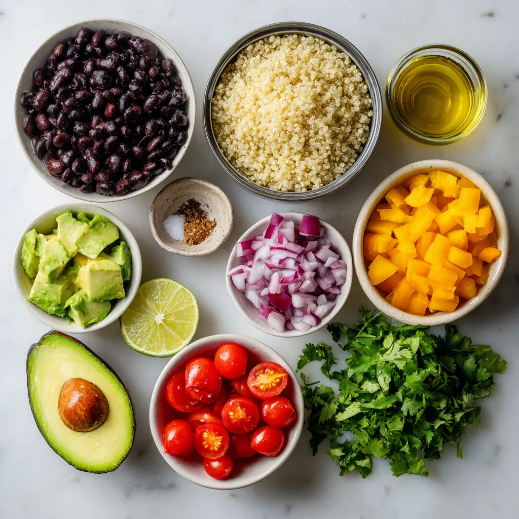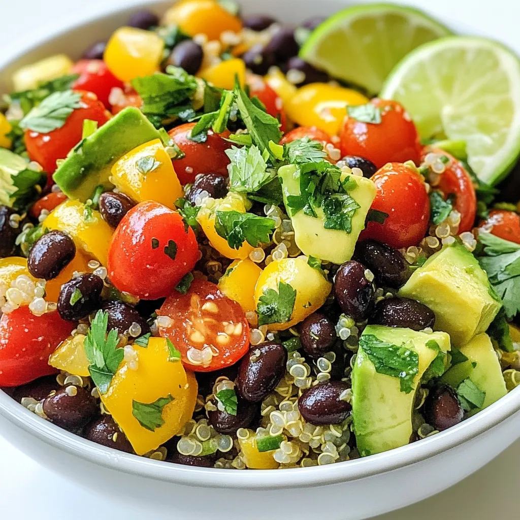 Each ingredient adds its own special flavor. Quinoa gives the salad a fluffy base and is packed with protein. Black beans add a creamy texture and more protein. The ripe avocado brings healthy fats and a smooth taste. Cherry tomatoes add sweetness and vibrancy. Red onion gives a sharp bite, while yellow bell pepper adds crunch and color. Fresh cilantro adds brightness, and lime juice gives a zesty kick. Olive oil helps tie everything together while cumin adds warmth.
