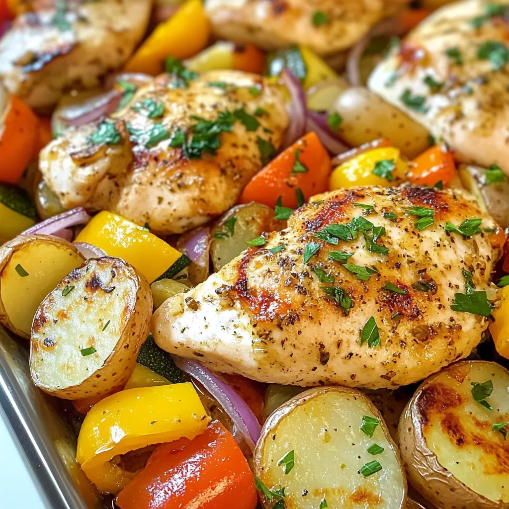 A delicious and easy one-pan meal featuring marinated chicken breasts and colorful vegetables.
