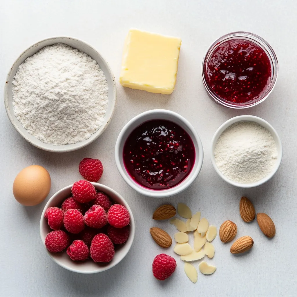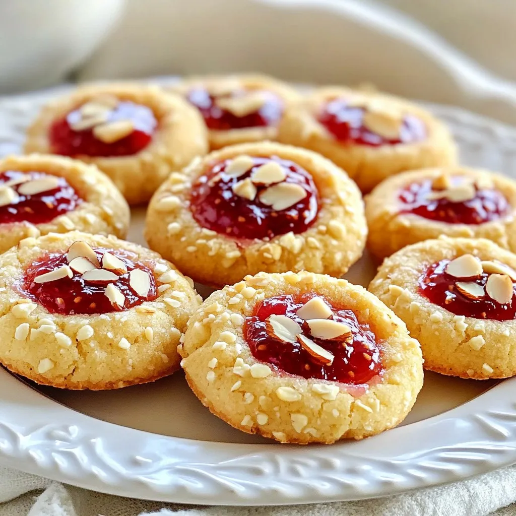 - 1 cup unsalted butter, softened Butter gives these cookies a rich taste. It helps make them soft and chewy. - 1 cup granulated sugar Sugar adds sweetness. It also helps create that lovely golden color. - 1 large egg The egg binds all the ingredients. It helps the cookies rise and stay soft. - 1 teaspoon vanilla extract Vanilla adds a warm flavor. It enhances the sweetness of the cookies. - 2 cups all-purpose flour Flour gives the cookies structure. It supports all the other ingredients. - 1 cup almond flour Almond flour adds a nutty taste. It makes the cookies tender and unique. - 1/2 teaspoon salt Salt balances the sweetness. It brings out the flavors in each bite. - 1/4 teaspoon baking powder Baking powder helps the cookies rise. It makes them light and fluffy. - 1/2 cup raspberry jam (or any jam of your choice) Jam fills the thumbprint. It brings a burst of fruity flavor. - Sliced almonds for topping Almonds add crunch. They also enhance the almond flavor in the cookies. Each ingredient plays a key role. Together, they create a delightful treat that is full of flavor. {{ingredient_image_1}} 1. Preheat your oven to 350°F (175°C). This ensures even baking. 2. Line two baking sheets with parchment paper. This helps prevent sticking. 3. In a mixing bowl, cream 1 cup of softened butter and 1 cup of granulated sugar. Mix until it looks light and fluffy. 4. Beat in 1 large egg and 1 teaspoon of vanilla extract. This adds moisture and flavor. 5. In a separate bowl, whisk together 2 cups of all-purpose flour, 1 cup of almond flour, 1/2 teaspoon of salt, and 1/4 teaspoon of baking powder. This helps the cookies rise. 1. Use your hands to form small balls of dough. Each ball should be about 1 inch wide. 2. Place them on the baking sheets, leaving about 2 inches between each ball. This allows space for spreading. 3. With your thumb or the back of a small spoon, gently press down in the center of each ball. This makes the thumbprint. 4. Fill each thumbprint with about 1 teaspoon of raspberry jam. Be careful not to overfill. 5. Sprinkle sliced almonds on top of each cookie for a crunchy finish. 1. Bake the cookies in your preheated oven for 12-15 minutes. Watch for the edges to turn lightly golden. 2. To check if they are done, look for a slight firmness when you touch them. 3. Allow the cookies to cool on the baking sheets for 5 minutes. This helps them set before moving. 4. After that, transfer them to wire racks to cool completely. This keeps the bottoms from getting soggy. To make these cookies fluffy, cream the butter and sugar well. This step helps add air and creates a light texture. Beat until the mix looks pale and fluffy. For the jam filling, use a thick consistency. This helps the jam hold its shape in the cookie. If it's too runny, it may spill over. Look for raspberry jam that is thick and spreadable. To ensure even baking, spread your cookies on the baking sheets with space. This way, heat can move around them. Bake two sheets at once, but rotate them halfway through for even cooking. Let the cookies cool on the sheets for five minutes before moving them. This keeps them from breaking. Use a wire rack to cool the cookies completely, which helps keep them crisp. If you need a butter alternative, use coconut oil or vegan butter. Both work well and give a nice flavor. For sugar, you can use brown sugar or a sugar substitute. If you want to make these cookies gluten-free, swap all-purpose flour with a gluten-free blend. Check the blend for best results. Use almond flour for a nutty taste, which fits perfectly in this recipe. Pro Tips Chill the Dough: Refrigerating the dough for 30 minutes before baking will help the cookies retain their shape and prevent spreading. Use Fresh Jam: For the best flavor, opt for high-quality, fresh raspberry jam or homemade jam if possible. Experiment with Flavors: Feel free to substitute the raspberry jam with other flavors like apricot, strawberry, or even chocolate for a unique twist. Storage Tips: Store the cookies in an airtight container at room temperature for up to a week to keep them fresh. {{image_2}} You can switch up the jam in these cookies. Try strawberry, apricot, or even blueberry. Each fruit adds its own unique taste. The nutty flavor of almond pairs well with many jams. You can also try different nuts on top. Chopped walnuts or pecans bring a new crunch. You might even sprinkle some coconut for a tropical twist. If you need to make these cookies gluten-free, use a gluten-free flour blend. Be sure to check that your jam is gluten-free too. For a vegan version, swap the butter for coconut oil or vegan butter. Use a flax egg instead of a regular egg. This keeps all the flavors while making it suitable for different diets. These cookies are great for decorating. During the holidays, add festive sprinkles or colored sugar. You can also use seasonal fruits. In summer, fresh raspberries can be used for a fresh burst. In fall, try apple or pumpkin spice jams for a cozy flavor. Making these small changes keeps the recipe exciting all year long! To store your Raspberry Almond Thumbprint Cookies at room temperature, place them in an airtight container. This helps keep them soft and tasty. Store them in a cool, dry place. You can use parchment paper between layers to prevent sticking. This small step really helps keep your cookies fresh. For long-term storage, freezing is a great option. First, let the cookies cool completely. Then, place them in a single layer on a baking sheet and freeze for about one hour. After that, transfer them to a freezer bag or container. Make sure to remove as much air as possible. When you want to enjoy them, simply take out the cookies and let them thaw at room temperature. These cookies can last about one week at room temperature. If you store them in the freezer, they can stay good for up to three months. Look for signs of spoilage like a change in smell or texture. If they feel hard or crumbly, it’s time to toss th