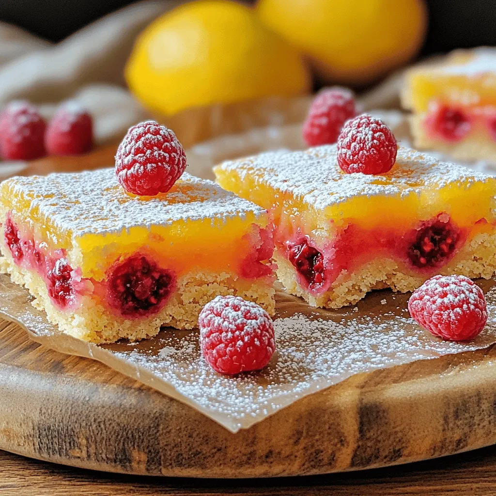 To make the best raspberry lemonade bars, you need fresh, high-quality ingredients. Here’s what you should gather: - 1 cup all-purpose flour - 1/4 cup powdered sugar - 1/2 cup unsalted butter, softened - 1/2 cup granulated sugar - 2 large eggs - 1/3 cup fresh lemon juice - Zest of 1 lemon - 1/2 cup fresh raspberries (plus extra for topping) - 1 teaspoon baking powder - Pinch of salt Each ingredient plays a key role in creating a sweet and tangy treat. The flour forms the base, while powdered sugar adds sweetness. Unsalted butter gives a rich flavor and smooth texture. Granulated sugar sweetens your filling, and eggs help bind everything together. Fresh lemon juice and zest brighten the dish. Raspberries provide a burst of flavor. Baking powder helps the bars rise, and salt balances the sweetness. For the full recipe, check out the entire list and instructions! - Preheat your oven to 350°F (175°C). - Line an 8x8 inch baking dish with parchment paper. Make sure to leave some overhang. This helps with easy removal later. - In a bowl, mix 1 cup of all-purpose flour, 1/4 cup of powdered sugar, and a pinch of salt. - Add in 1/2 cup of softened unsalted butter. Mix until it looks crumbly. - Press this crumbly mix evenly into the bottom of the baking dish. - In a separate bowl, whisk together 1/2 cup of granulated sugar and 2 large eggs. - Add 1/3 cup of fresh lemon juice, the zest of 1 lemon, and 1 teaspoon of baking powder. Mix until smooth. - Gently fold in 1/2 cup of fresh raspberries. Be careful not to break them. - Pour the filling over the crust. Spread it evenly with a spatula. - Bake in the oven for 20-25 minutes. The filling should be set and slightly golden around the edges. For the full recipe, check out the section above! To make the best Raspberry Lemonade Bars, start with softened butter. Softened butter mixes easier and gives a smooth crust. Always use fresh ingredients. Fresh lemons and ripe raspberries give the bars their sweet and tangy taste. Remember to adjust your baking time. Each oven is different, so watch the bars closely. Presentation matters when serving these bars. Dust them with powdered sugar right before serving. This adds a nice touch and makes them look fancy. For extra color, garnish with fresh raspberries and lemon wedges. This not only looks great but also adds flavor. {{image_2}} You can switch things up with flavor tweaks. If you want a different taste, substitute blueberries for the raspberries. Blueberries add a sweet touch that pairs well with lemon. You can also add a touch of mint for a refreshing twist. Mint gives a cool burst of flavor that brightens each bite. For those with dietary needs, there are great options. If you want a gluten-free crust, use almond flour or a gluten-free mix. These work well and still taste great. You can also explore vegan substitutes for eggs and butter. Use flax eggs or chia seeds for the eggs, and coconut oil in place of butter. This way, everyone can enjoy these bars! To keep your raspberry lemonade bars fresh, refrigerate them in an airtight container. This helps lock in moisture and flavor. You can store them in the fridge for up to five days. If you want to enjoy them later, freezing is a great option. To freeze the bars, first, let them cool completely. Then, cut them into squares. Wrap each square tightly in plastic wrap. Place the wrapped bars in a freezer-safe bag or container. They can last in the freezer for about three months. When you want to enjoy a bar, take it out of the freezer. Let it thaw in the fridge for a few hours or at room temperature for about an hour. This way, you can savor that sweet and tangy flavor whenever you like. For the full recipe, check the earlier sections. You can use frozen raspberries instead of fresh ones. They work well, too. Just be sure to thaw and drain them before using. You can also try other berries like strawberries, blueberries, or blackberries. Each berry gives a different taste, so feel free to mix them! Yes, you can make these bars a day in advance. They taste great after chilling in the fridge overnight. Just cover them well to keep them fresh. If you want the best flavor, serve them within two days. To check if the bars are done, look for a slight golden edge. You can also insert a toothpick in the center. If it comes out clean, they are ready! Let them cool completely before cutting for the best texture. This blog post showed you how to make tasty lemon raspberry bars. You learned about the key ingredients, the steps to prepare them, and tips for success. Keep fresh ingredients on hand for the best flavor. Remember, you can swap ingredients for fun variations. Store leftovers properly to enjoy them later. With this knowledge, you can bake these delightful bars for any occasion, impressing everyone with your skills. Dive in and start baking!