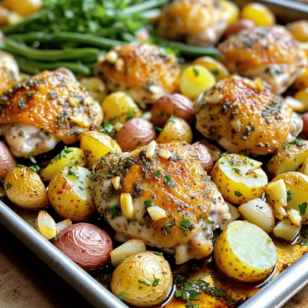 These main ingredients work together to create a rich and savory dish. The chicken thighs provide juicy meat, while garlic adds a sweet, roasted flavor. Baby potatoes soak up the herbs, and green beans give a fresh crunch.