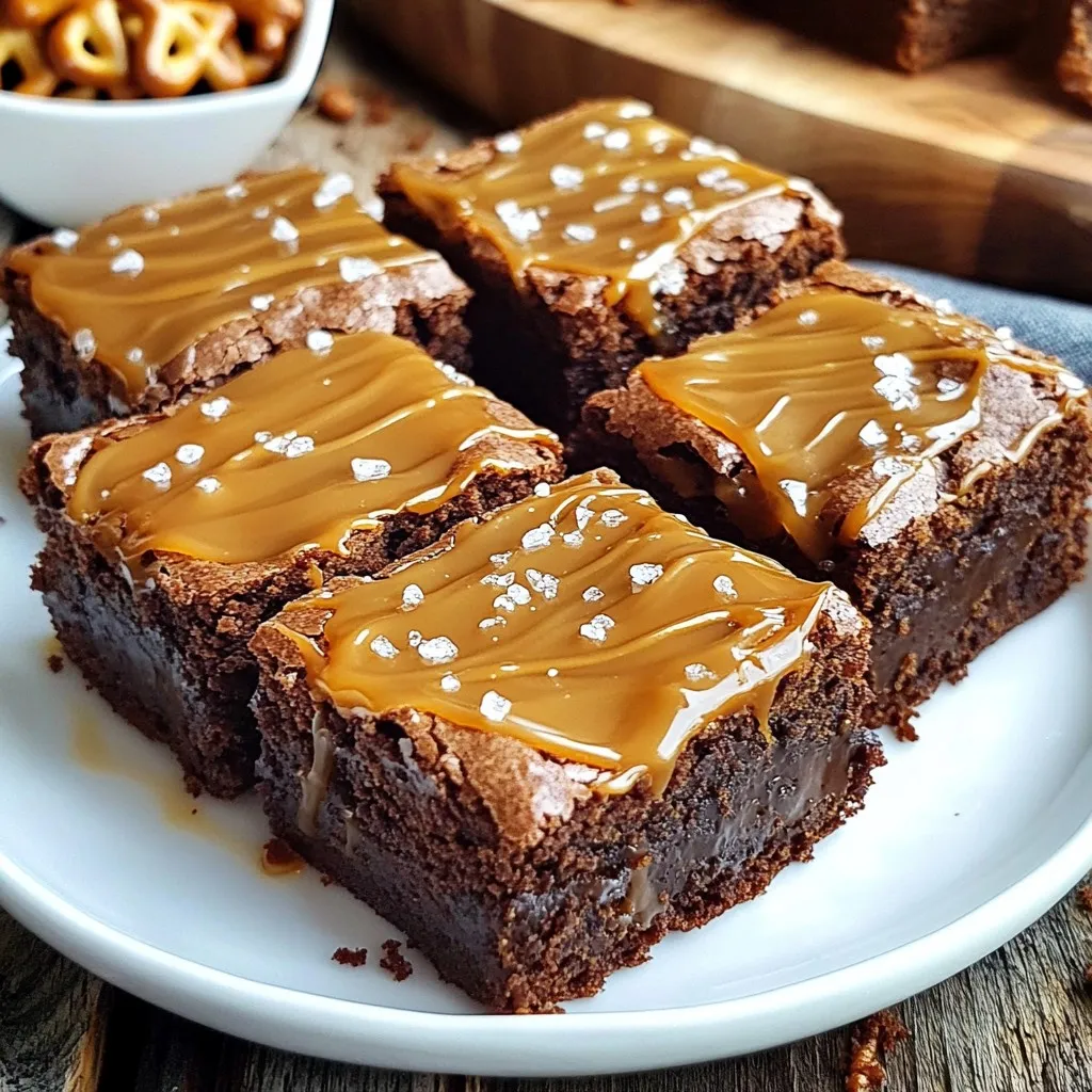 Serve the brownies on a rustic wooden board and drizzle additional caramel sauce on top for a decadent look. Garnish with extra pretzel pieces and a sprinkle of sea salt for an appealing finish.