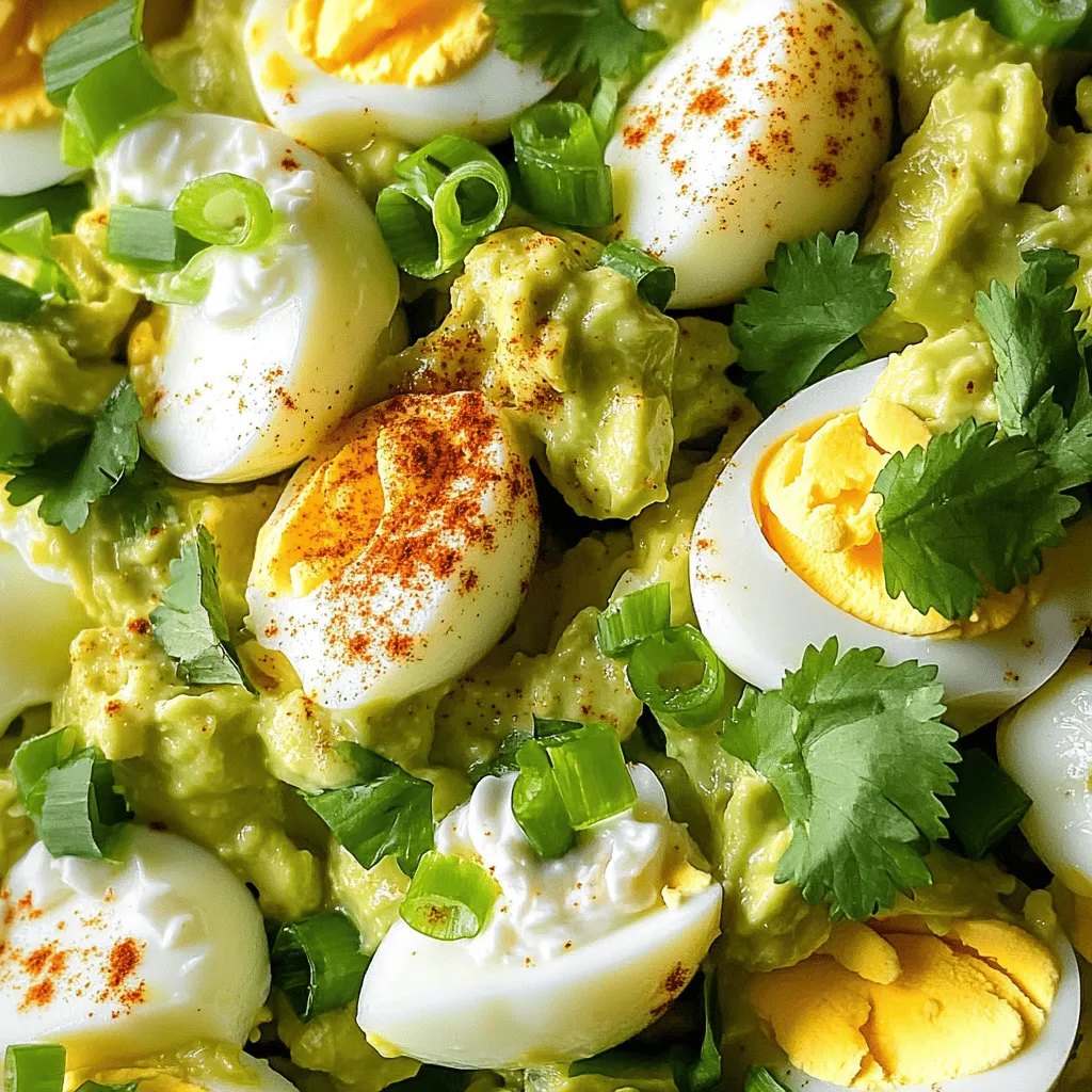 ![- 4 large eggs - 1 ripe avocado - 2 tablespoons Greek yogurt - 1 tablespoon Dijon mustard - 1 tablespoon freshly squeezed lemon juice - 2 green onions, finely chopped - Salt and pepper to taste - 1/4 teaspoon smoked paprika - Fresh cilantro, for garnish (optional) Using fresh ingredients makes a big difference. Fresh eggs taste better and have a nice texture. Ripe avocados bring a creamy feel. They add healthy fats, too. Fresh green onions give a crisp bite. They enhance flavor in every bite. When you use fresh, you get the best taste and nutrients. - Eggs: They are high in protein. They also contain essential vitamins and minerals. - Avocado: Packed with healthy fats, fiber, and vitamins. It supports heart health. - Greek yogurt: A good source of protein and probiotics. It helps with digestion. - Dijon mustard: Low in calories and adds flavor without extra fat. - Lemon juice: High in vitamin C. It adds freshness and brightness. - Green onions: Low in calories and high in vitamins A and K. - Salt and pepper: Enhance flavor without adding extra calories. - Smoked paprika: Adds a unique flavor and is rich in antioxidants. - Cilantro: Optional but fresh herbs add extra nutrients and flavor. This Avocado Egg Salad combines great taste with health benefits. Check out the Full Recipe to see how easy it is to make! First, take four large eggs and place them in a pot. Cover the eggs with cold water. Turn the heat to medium-high and bring the water to a boil. Once boiling, cover the pot and remove it from the heat. Let the eggs sit for 10-12 minutes. This will make hard-boiled eggs. Afterward, cool the eggs in cold water for easier peeling. While the eggs cool, grab one ripe avocado. Cut it in half and remove the pit. Use a spoon to scoop the green flesh into a mixing bowl. Mash the avocado with a fork. Aim for a smooth but slightly chunky texture. This adds great flavor and creaminess to the salad. Once the eggs are cool, peel and chop them into small pieces. Now, add the chopped eggs to the bowl with the mashed avocado. Next, mix in two tablespoons of Greek yogurt, one tablespoon of Dijon mustard, and one tablespoon of fresh lemon juice. Don't forget to add two finely chopped green onions, salt, pepper, and a touch of smoked paprika. Gently fold all the ingredients together. Make sure everything is well combined. Taste your egg salad and adjust the seasoning if needed. You can serve it right away or refrigerate it for up to 2 hours. For the full recipe, check out the earlier section. To pick a ripe avocado, gently squeeze it. It should feel soft but not mushy. Look for a dark green or black skin. Avoid ones with large dents or brown spots. If you find a firm avocado, you can let it ripen at room temperature. After a few days, it will be ready to use. The key to a great egg salad is texture. I like to mash the avocado until it's smooth but still has some chunks. This adds creaminess and flavor. When you add the eggs, chop them into small pieces. This way, you get a nice balance of avocado and egg in every bite. Mixing gently helps keep some texture, so your salad doesn’t become mushy. If you have leftovers, store them in an airtight container. This keeps the salad fresh and tasty. You can refrigerate it for up to two hours after making it. If you want to save it longer, use lemon juice to prevent browning. This keeps the salad looking and tasting great. Avoid freezing, as it may change the texture. Enjoy it within a couple of days for the best flavor! {{image_2}} You can make this avocado egg salad even better by adding more flavors. Try mixing in some diced tomatoes for a burst of freshness. Chopped bell peppers add a nice crunch. If you like heat, add a pinch of cayenne or a splash of hot sauce. For a fruity twist, fold in some diced mango or pineapple. These extras make your salad exciting and unique. How you serve this salad can change the whole vibe. Enjoy it on whole grain toast for a hearty brunch. You can also scoop it into lettuce leaves for a light lunch. If you're feeling fancy, serve it in an avocado half. For a picnic, pack it in whole wheat wraps. Each option offers a new way to enjoy this tasty dish. You can easily adapt this recipe to fit different diets. For a vegan version, swap the eggs for chickpeas. Mash them with avocado and add the same mix-ins. If you're following a paleo diet, leave out the yogurt and use olive oil instead. This keeps it creamy without dairy. These changes make the salad fit your needs while keeping it delicious. To keep your avocado egg salad fresh, use an airtight container. Make sure it seals tightly. This keeps out air and helps retain flavor. If you plan to eat it later, store it in the fridge right away. Avocado egg salad is best eaten within 2 days. After that, it starts to lose its taste and texture. Always check for any off smells or changes in color. If it looks brown or smells funny, it’s time to toss it. I do not recommend freezing avocado egg salad. The texture of the avocado changes when frozen. It may become mushy when thawed. Instead, refrigerate it for a quick meal. If you follow the [Full Recipe], you can easily whip up a new batch whenever you want! Yes, you can use other types of mayonnaise. Some people prefer light mayo or vegan mayo. Each type will change the taste slightly. You can also try flavored mayo for a unique twist. I often use Greek yogurt in my recipe for a creamy texture. It adds protein and a nice tang as well. You can keep avocado egg salad in the fridge for about two days. After that, the avocado may brown and the flavors might fade. Always cover it well to keep it fresh. If you notice browning, you can mix in a little lemon juice. This helps keep the salad looking nice longer. Avocado egg salad pairs well with many foods. Try it on whole-grain bread, lettuce wraps, or crackers. You can also serve it with fresh veggies like cucumber or bell pepper. For a light meal, enjoy it with a side salad. Check out the Full