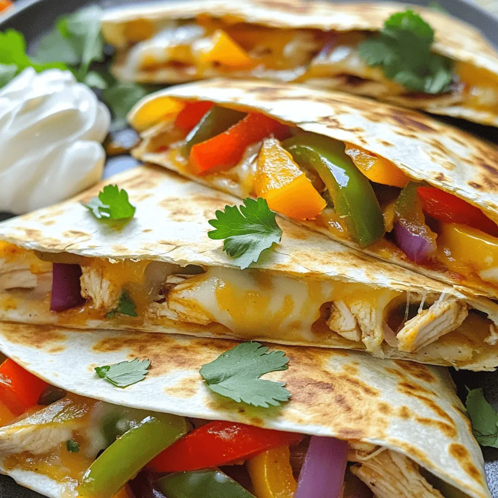 Once cooked, remove the quesadillas from the skillet. Let them cool for a minute before slicing them into wedges. For a nice finish, garnish with chopped fresh cilantro. Serve with sour cream and salsa on the side. Enjoy your savory chicken fajita quesadillas!