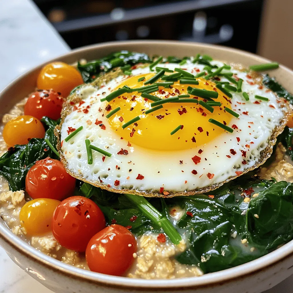 The Savory Oatmeal Bowl with Egg is simple yet filling. Each ingredient plays a role. The oats provide warmth and comfort. Vegetable broth adds flavor. Olive oil gives richness. Garlic wakes up the dish. Spinach adds color and nutrients. Cherry tomatoes bring sweetness. Finally, the egg tops it all off with protein.