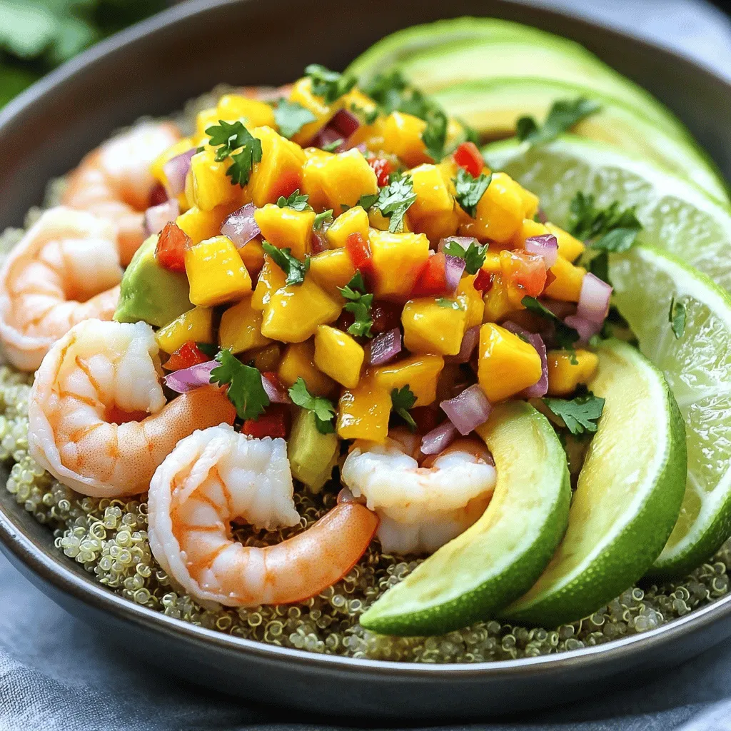 To make your bowls eye-catching, start with the quinoa. Spread it out to create a colorful base. Pile the shrimp and avocado high for a great look. Finally, top with a generous amount of mango salsa. For an extra punch, drizzle some fresh lime juice or olive oil over the top. This adds flavor and makes your dish shine.