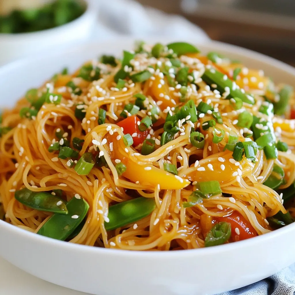 Now it’s time for the veggies! Take 1 bell pepper, julienned, and 1 cup of snap peas. Add them to the pan with garlic and ginger. Stir-fry for 2 to 3 minutes. The veggies should be tender-crisp. In a small bowl, mix 3 tablespoons of sweet chili sauce, 2 tablespoons of soy sauce, and 1 tablespoon of sesame oil. Pour this sauce over the veggies. Stir well to coat everything. Then, add the rice noodles to the pan. Toss everything together for another 2 to 3 minutes. Make sure the noodles are hot and coated in sauce. Finally, remove from heat and stir in half of the chopped green onions. Your sweet chili garlic noodles are ready to serve!