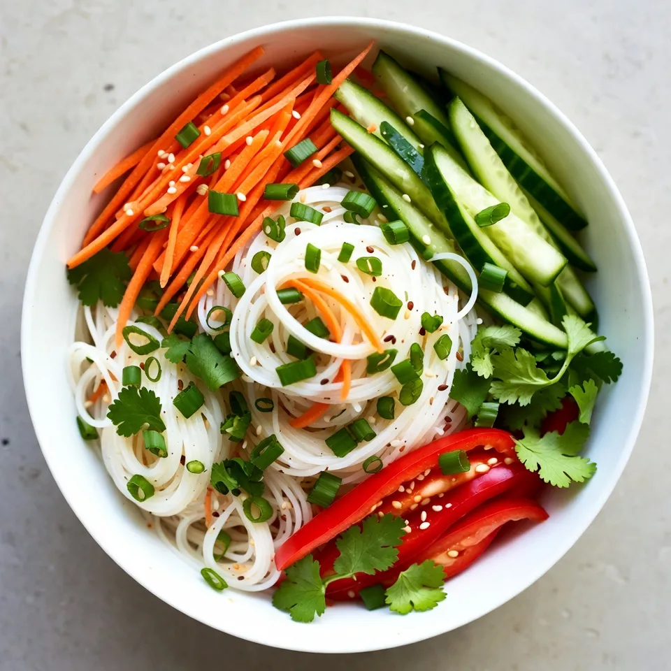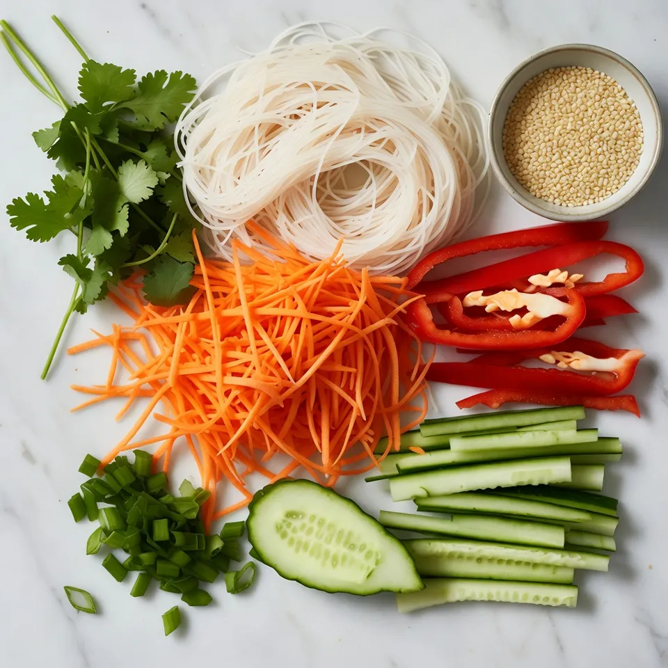 Gather these ingredients before you start. Fresh veggies make this dish vibrant. I love using rice noodles for their light texture. Shredded carrots add color and crunch. The red bell pepper gives sweetness and a lovely pop. Cucumber adds a refreshing bite, while green onions bring a hint of sharpness. Fresh cilantro elevates the flavor profile with its herbaceous notes. Finally, sesame seeds add a nutty finish that ties everything together.