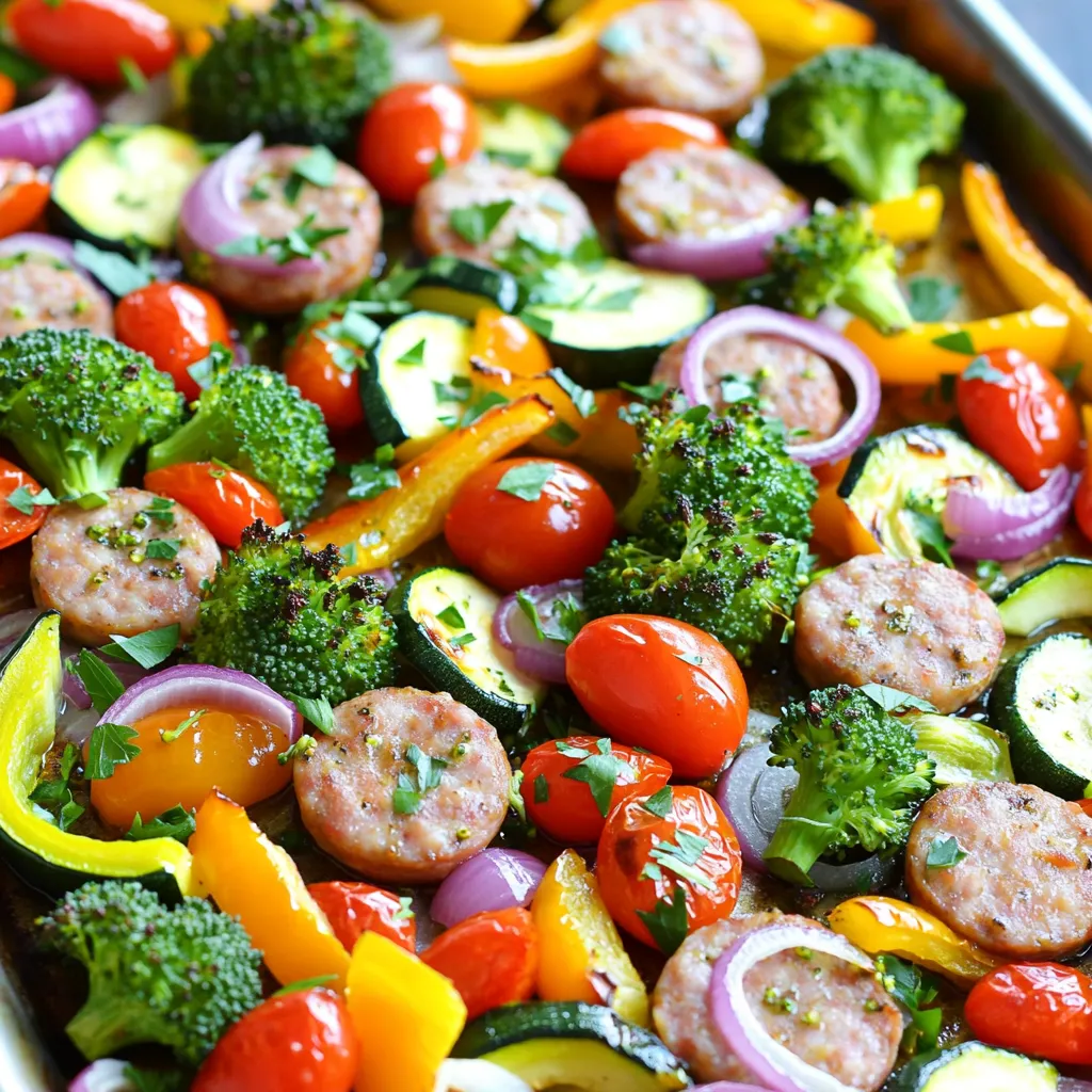 ![To make this tasty dish, gather the following ingredients: - 1 pound Italian chicken sausage, sliced - 1 bell pepper (any color), sliced - 1 zucchini, sliced - 1 red onion, cut into wedges - 1 cup cherry tomatoes, halved - 2 cups broccoli florets - 3 tablespoons olive oil - 2 teaspoons dried oregano - 1 teaspoon garlic powder - Salt and pepper to taste - Fresh parsley for garnish (optional) When measuring your ingredients, keep these tips in mind: - Use a kitchen scale for precise sausage weight. - Chop vegetables into similar sizes for even cooking. - Measure olive oil with a tablespoon for accuracy. - Use teaspoons for the dried herbs and spices. You can swap some ingredients if needed: - Use turkey sausage for a lighter option. - Try different veggies like carrots or green beans for variety. - Substitute fresh herbs for dried ones for a burst of flavor. - Use avocado oil instead of olive oil for a different taste. For the full recipe, check out the detailed cooking steps above. First, gather all your ingredients. You need: - 1 pound Italian chicken sausage, sliced - 1 bell pepper (any color), sliced - 1 zucchini, sliced - 1 red onion, cut into wedges - 1 cup cherry tomatoes, halved - 2 cups broccoli florets - 3 tablespoons olive oil - 2 teaspoons dried oregano - 1 teaspoon garlic powder - Salt and pepper to taste - Fresh parsley for garnish (optional) Next, preheat your oven to 425°F (220°C). This step is key for even cooking. While the oven heats, slice your sausage and veggies. Make sure to cut them into similar sizes. This helps them cook at the same rate. Now, take a large sheet pan. Spread the sliced sausage evenly across it. Add your sliced bell pepper, zucchini, onion, cherry tomatoes, and broccoli florets on top. Drizzle the olive oil over everything. Then, sprinkle the oregano, garlic powder, salt, and pepper. Toss everything together well. Ensure that each piece gets coated. This makes for great flavor. Spread the mixture in a single layer on the pan. This helps everything cook evenly. Bake in the oven for 25 to 30 minutes. Stir halfway through cooking. This ensures even browning. Your dish will be done when the sausage is cooked and veggies are tender. Once cooked, remove the pan from the oven. Let it cool for a few minutes. Garnish with fresh parsley if you like. This adds a nice touch to the dish. For even cooking, keep these tips in mind: - Cut all ingredients to similar sizes. - Use a large sheet pan to avoid overcrowding. - Stir halfway through baking for even browning. Follow these steps and tips, and you’ll create a delicious meal that everyone will love. For the complete recipe, check out the [Full Recipe]. To make this dish pop, you can try some simple tricks. Use fresh herbs like basil or thyme. They add a bright taste. You can also add a splash of lemon juice before serving. This freshens the dish and lifts the flavors. Don’t shy away from spices. Try adding paprika or red pepper flakes for heat. These will give your meal a fun twist. Cooking time can vary based on your oven and the size of the veggies. If you cut your veggies smaller, they cook faster. Check for doneness around 20 minutes. The sausage should be well-cooked, and the veggies tender. You can always add a few more minutes if needed. Just keep an eye on them to avoid burning. This dish goes great with many sides. You can serve it with rice or quinoa for a filling meal. A simple green salad is also a nice touch. The coolness of the salad balances the warm dish. For a heartier option, serve it with crusty bread. It’s perfect for soaking up the tasty juices. If you want to keep it light, pair it with steamed veggies. This keeps the meal fresh and healthy. {{image_2}} You can change up the sausage to fit your taste. Try using turkey sausage for a lighter dish. Or, use chorizo for a bold flavor. If you prefer plant-based options, try vegan sausage. Each choice adds a unique taste. The cooking time stays roughly the same. Feel free to swap out the veggies. Carrots add sweetness and color. Sweet potatoes give a hearty touch. You can also use asparagus or green beans for a crunchy bite. Just cut them to similar sizes for even cooking. Keep it colorful for a more inviting dish. Want some heat? Add red pepper flakes or jalapeños. They pack a punch without overwhelming the dish. For a milder flavor, skip the spicy additions. You can also use sweet Italian sausage for a gentle taste. Adjust the seasonings to suit your spice level. Store your leftover sheet pan sausage and veggies in an airtight container. Place it in the fridge. It should stay fresh for up to three days. Before you eat it, check for any off smells or changes in texture. Always make sure to use your best judgment. If you want to save some for later, freezing is a great option. Let the dish cool down completely. Then, divide it into single-serving portions. Use freezer-safe bags or containers to avoid freezer burn. It can last for up to three months in the freezer. When you're ready to eat it, just thaw in the fridge overnight. To reheat, use the oven or microwave. For the oven, preheat to 350°F (175°C). Spread the sausage and veggies on a baking sheet. Heat for about 15 minutes or until warm. If using a microwave, place a portion in a bowl and cover it. Heat for 1-2 minutes, stirring halfway. Enjoy your meal again with ease! You can make this dish healthier by using lean sausage. Turkey or chicken sausage works well. You can also add more vegetables. Try adding spinach, carrots, or cauliflower. Using less oil can cut calories. Instead of three tablespoons, use just one or two. Season with herbs and spices for flavor without the extra fat. Yes, you can use frozen vegetables! They save time and are easy to find. Just be sure to thaw them first. Drain any extra water to avoid sogginess. Frozen veggies usually cook faster. Check them a bit early to prevent overcooking. They can be just as tasty as fresh ones. You can customize this recip