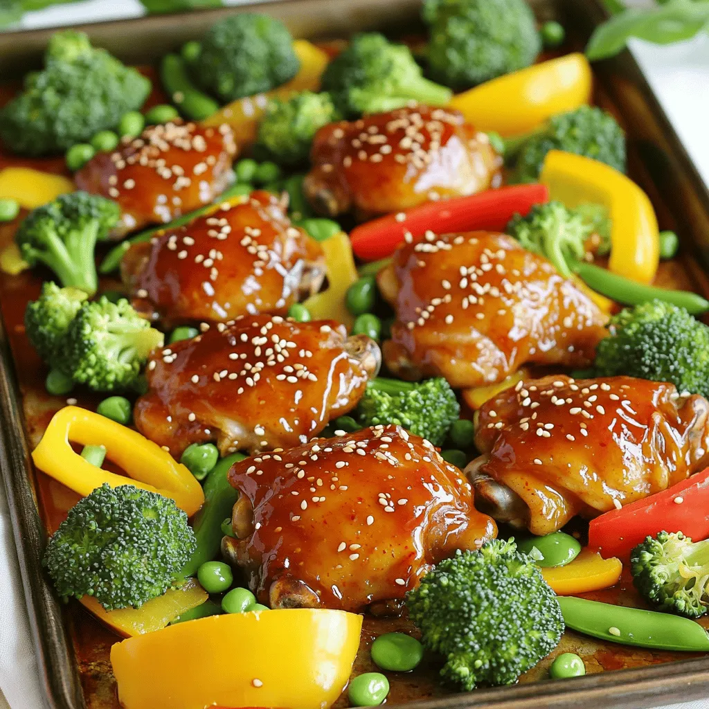 To make this dish, gather these key items: - 4 boneless, skinless chicken thighs - 1 cup sweet chili sauce - 2 tablespoons soy sauce (low sodium) - 1 tablespoon garlic, minced - 1 tablespoon fresh ginger, grated - 1 bell pepper (red or yellow), sliced - 1 cup broccoli florets - 1 cup snap peas - 2 tablespoons olive oil - Salt and pepper to taste - Sesame seeds for garnish - Chopped green onions for garnish These ingredients work together to create a wonderful flavor profile. The sweet chili sauce brings a nice sweetness with a hint of heat. The garlic and ginger add depth and aroma, making every bite exciting. For a pop of color and flavor, I suggest these garnishes: - Sesame seeds - Chopped green onions These toppings give your dish a pleasant crunch and fresh taste. You can also add lime wedges for a zesty finish. It’s a simple way to elevate your meal. You can swap some ingredients if needed. If you don’t have chicken thighs, chicken breasts work just as well. For a vegetarian option, try tofu or tempeh. If sweet chili sauce isn’t available, a mix of honey and hot sauce can work. Low-sodium soy sauce is best, but you can use regular if that’s what you have. Remember, cooking is all about being creative! Adjust flavors to your liking, and don’t be afraid to experiment. Explore the [Full Recipe] for complete instructions and tips. Start by preheating your oven to 400°F (200°C). This step is key for cooking the chicken evenly. Next, make the marinade. In a bowl, mix the sweet chili sauce, soy sauce, minced garlic, and grated ginger. This mix packs a punch! Reserve about 2 tablespoons of this sauce for later. Now, grab your chicken thighs. Place them in a large zip-top bag or bowl. Pour the marinade over the chicken. Make sure every piece is coated well. Let it sit in the fridge for at least 30 minutes. If you have time, marinate for up to 2 hours. This extra time helps deepen the flavors. While the chicken marinates, prepare your veggies. Slice the bell pepper and rinse the broccoli and snap peas. These colorful veggies add great crunch and taste. Line a large sheet pan with parchment paper or foil. This makes cleanup easy. Place the marinated chicken thighs in the center of the pan. Arrange the bell pepper, broccoli, and snap peas around the chicken. Drizzle the veggies with olive oil. Season them with salt and pepper to taste. Now it’s time to bake! Slide the sheet pan into your hot oven. Bake for 25 to 30 minutes. The chicken should reach an internal temperature of 165°F (74°C) and look caramelized. In the last 5 minutes, take the reserved marinade and brush it over the chicken. This step adds more flavor and a nice glossy finish. When the timer goes off, carefully remove the pan from the oven. Let it rest for a few minutes. Before serving, sprinkle sesame seeds and chopped green onions on top. This extra touch makes the dish look great. For the full recipe, check out the details above. To keep your chicken juicy, marinate it well. Use sweet chili sauce, soy sauce, garlic, and ginger. This mix adds flavor and moisture. Let the chicken sit in the marinade for at least 30 minutes. For even better results, marinate for two hours. This extra time helps the chicken absorb all those tasty flavors. Oven temperatures can vary. If your oven runs hot, check the chicken early. Aim for 25 minutes, then use a meat thermometer. The chicken should reach 165°F (74°C). If your oven runs cool, you may need 30 minutes or more. Always trust your thermometer over the timer for the best results. Prep your veggies while the chicken marinates. Slice the bell pepper and rinse your broccoli and snap peas. Cut them into even pieces for quicker cooking. Spread the veggies around the chicken on the sheet pan. Drizzle with olive oil and season. This way, they cook evenly and soak up the chicken's flavors. For the perfect finish, add a touch of salt and pepper before baking. Check out the Full Recipe for more tips! {{image_2}} You can swap chicken thighs with other proteins. Try using chicken breasts for a leaner option. They cook fast and still soak up the sweet chili sauce. If you want something different, use shrimp. Shrimp cooks quickly and takes on the sauce's flavor well. For a vegetarian twist, consider tofu. Press it to remove excess water and cut it into cubes. Marinate it just like the chicken for great taste. The beauty of this dish lies in its versatility. You can use any vegetables you have on hand. In spring, try asparagus or snap peas for a fresh crunch. Summer calls for zucchini or corn, adding sweetness. In fall, consider Brussels sprouts or carrots for warmth. Winter vegetables like cauliflower or kale work great too. Always remember to cut veggies into even pieces for even cooking. If you love heat, add some spice to your sweet chili chicken. Mix in a teaspoon of red pepper flakes in the marinade. You can also use sriracha or another hot sauce for a kick. For an extra layer of flavor, try adding sliced jalapeños to the pan. These spicy options will balance the sweet chili sauce well. Adjust the heat level to your taste, and enjoy every bite! For the full recipe, check out the complete instructions above. After enjoying your meal, cool the leftovers quickly. Place them in an airtight container. Make sure to store the chicken and veggies together or separately. This keeps them fresh. Refrigerate them within two hours. The leftovers will last up to three days in the fridge. Always check for any bad smells or signs of spoilage before eating. To reheat your sweet chili chicken, use an oven or stovetop for the best taste. Preheat your oven to 350°F (175°C). Place the chicken and veggies on a baking sheet. Cover them with foil to keep moisture. Heat for about 15-20 minutes. If using a stovetop, heat a pan over medium heat. Add a splash of water to keep it moist. Cook until warmed through. Avoid using the microwave, as it can make the chicken dry. You can freeze leftovers if you want
