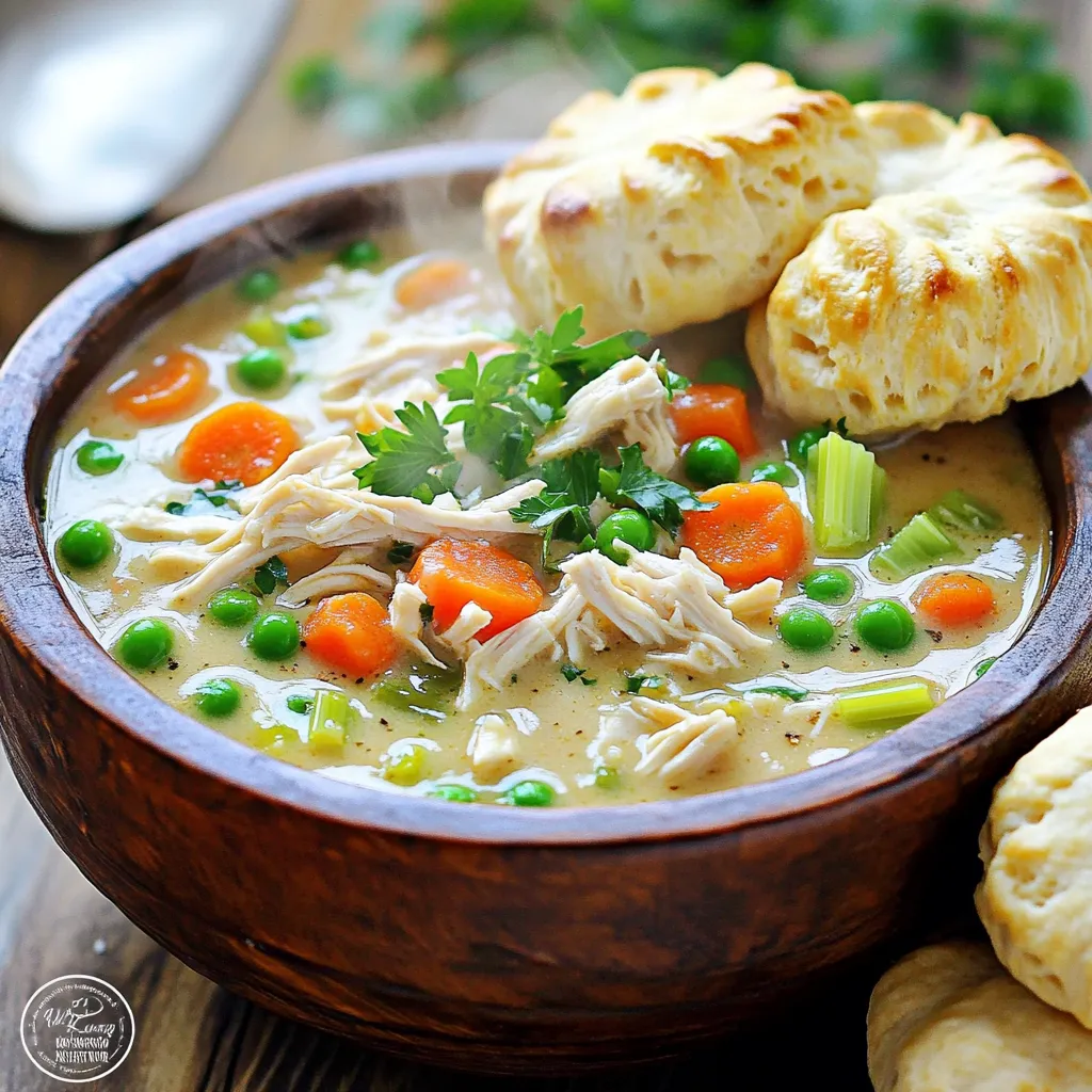 To make this cozy chicken pot pie soup, you will need: - 1 lb boneless, skinless chicken breasts - 4 cups chicken broth - 1 cup diced carrots - 1 cup diced celery - 1 cup frozen peas - 1 medium onion, chopped - 3 cloves garlic, minced - 1 teaspoon dried thyme - 1 teaspoon dried rosemary - 1 bay leaf - Salt and pepper to taste - 1 cup heavy cream - 1/4 cup all-purpose flour (for thickening) - 1 tablespoon olive oil These ingredients come together to create a rich and creamy soup. The chicken adds protein, while the broth provides a savory base. Carrots, celery, and peas contribute freshness and color. For an extra touch, consider adding: - Biscuit dough or puff pastry These options offer a delightful, flaky side that pairs perfectly with the soup. You can bake them separately and serve them warm alongside the soup. Seasonings elevate the flavor of the soup. You will use: - Dried thyme - Dried rosemary - Bay leaf - Salt and pepper These herbs add warmth and depth. Thyme and rosemary bring a savory note, while bay leaf enhances the overall flavor. Adjust the salt and pepper to suit your taste. This combination of ingredients makes a simple yet rich soup that warms you from the inside out. Enjoy crafting this dish with these key components! Start by heating a skillet over medium heat. Add one tablespoon of olive oil. Place the boneless, skinless chicken breasts in the skillet. Sear each side for about 3 to 4 minutes. You want them to be lightly browned. Once done, remove the chicken from the heat and set it aside. This step adds nice flavor to your soup. In the same skillet, add chopped onion, diced carrots, diced celery, and minced garlic. Cook these for about 5 minutes. Stir them often until the vegetables start to soften. This will build a great base for your soup. After that, transfer the sautéed mixture to the slow cooker. Add the seared chicken, 4 cups of chicken broth, dried thyme, dried rosemary, bay leaf, and some salt and pepper. Stir everything together to mix well. Cover the slow cooker and set it to low for 6 to 7 hours or high for 3 to 4 hours. The chicken needs to be cooked through and tender. Once it's done, take out the chicken and shred it using two forks. Return the shredded chicken back to the pot. In a separate bowl, whisk together 1 cup of heavy cream and 1/4 cup of all-purpose flour until smooth. Stir this mixture into the soup. Cook on high for another 30 minutes to let it thicken up. During the last 10 minutes, add in the frozen peas. Taste the soup and adjust the seasoning if needed. When ready, ladle the soup into bowls and garnish with fresh parsley. If you like, serve with warm biscuit dough or puff pastry on the side. Enjoy your cozy meal! To get the best flavor in your soup, use fresh herbs. Thyme and rosemary add depth. Searing the chicken first brings out great taste. Use good quality chicken broth for a richer base. Don’t skip the salt and pepper; they enhance all the flavors. For a thicker soup, mix flour with cream before adding. You can replace flour with cornstarch for a gluten-free option. If you want a creamier texture, add more cream. You can also use mashed potatoes to thicken. Just stir them in slowly until smooth. Searing the chicken adds a nice brown color and flavor. If you’re short on time, skip it. The soup will still taste good. Searing helps seal in juices, making the chicken tender. If you skip, just add the raw chicken straight to the slow cooker. {{image_2}} For a low-carb version, swap the heavy cream with coconut cream. This change keeps the soup rich while cutting carbs. You can also use cauliflower rice instead of flour for thickening. This keeps the soup thick without added carbs. Replace the potatoes and peas with zucchini and mushrooms for a new twist. These veggies add flavor without the carbs. To make this soup vegetarian, leave out the chicken. Instead, use chickpeas or lentils for protein. You can also add more vegetables, like bell peppers and green beans. Swap chicken broth for vegetable broth for a full flavor. Use the same spices to keep that cozy taste. This version is great for those who want a meat-free meal. You can customize this soup with your favorite vegetables. Try adding corn for sweetness or spinach for extra nutrients. Broccoli or green beans can also add crunch. Just remember to adjust cooking times. Softer veggies, like zucchini, need less time, while root veggies, like potatoes, may need more. This flexibility keeps the soup exciting every time you make it! To store leftovers, let the soup cool down first. Then, use an airtight container. This helps keep it fresh. I recommend using glass containers for best results. Label your container with the date you made it. You can store it in the fridge for up to 3 days. If you want to freeze the soup, let it cool completely. Pour the soup into freezer-safe bags or containers. Leave some space at the top for expansion. Seal them well and label with the date. You can freeze the soup for up to 3 months. Just remember, the cream may change texture after freezing. When ready to eat, thaw the soup overnight in the fridge. Pour the soup into a pot over medium heat. Stir often to avoid sticking. If the soup is too thick, add a little broth or water. Heat until warm. You can also use the microwave. Just heat in short bursts, stirring in between. Enjoy your cozy meal! Yes, you can make this soup without heavy cream. You can use milk or a dairy-free alternative. The soup will be lighter but still taste great. If you want creaminess, try adding a bit of sour cream or Greek yogurt. This adds flavor and keeps it rich. You can store chicken pot pie soup in the fridge for up to four days. Make sure to keep it in a sealed container. If you want to keep it longer, you can freeze it. In the freezer, it lasts for up to three months. A 6-quart slow cooker works best for this recipe. It gives enough space for all the ingredients. If you have a larger cooker, you can still use it. Just 