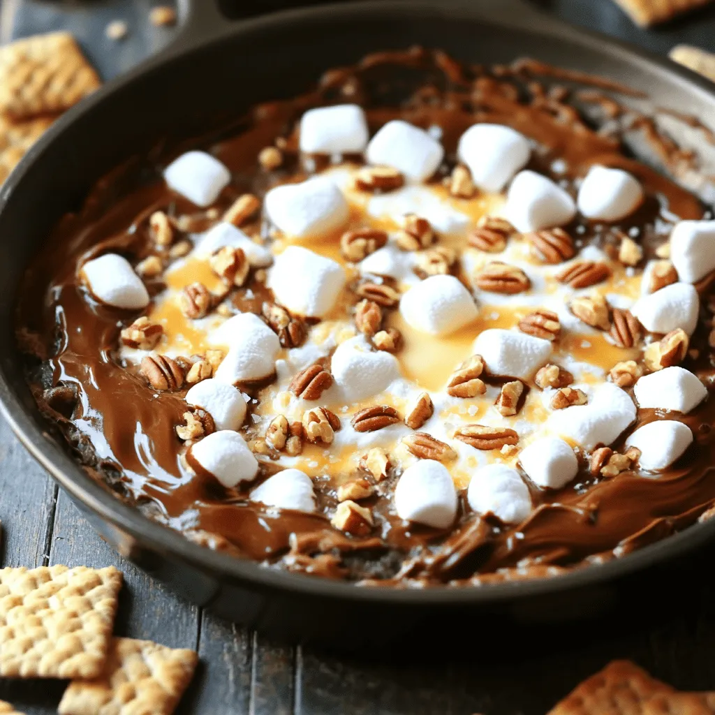 To make the perfect S'mores Dip, gather these simple items: - 1 cup semi-sweet chocolate chips - 1 cup mini marshmallows - 1 tablespoon unsalted butter - 1 teaspoon vanilla extract - 1/4 teaspoon sea salt - Graham crackers, for dipping - Optional: 1/4 cup chopped nuts (like pecans or walnuts) for added crunch Using quality ingredients makes a big difference. I recommend using real semi-sweet chocolate chips. They melt smoothly and taste great. Choose fresh mini marshmallows for the best texture. The butter should be unsalted to control the saltiness. Always use pure vanilla extract for a richer flavor. Fresh sea salt enhances the taste and balances sweetness. If you don't have some ingredients, don't worry! Here are some easy swaps: - Use dark chocolate chips if you like a deeper flavor. - Replace mini marshmallows with large marshmallows, just cut them into smaller pieces. - Coconut oil can replace unsalted butter, but it will change the taste slightly. - Maple syrup can stand in for vanilla extract for a unique twist. - For a nut-free option, skip the nuts or use seeds like pumpkin seeds. These substitutes keep your S'mores Dip tasty and fun, no matter what! For the full recipe, check out the steps included. First, gather all your ingredients. You will need: - 1 cup semi-sweet chocolate chips - 1 cup mini marshmallows - 1 tablespoon unsalted butter - 1 teaspoon vanilla extract - 1/4 teaspoon sea salt - Graham crackers, for dipping - Optional: 1/4 cup chopped nuts Next, preheat your oven to 350°F (175°C). This step is very important. It helps the dip cook evenly. In an oven-safe skillet or baking dish, layer the chocolate chips at the bottom. Make sure they are spread out well. Then, sprinkle mini marshmallows over the chocolate chips. The marshmallows will puff up as they bake. Now, drizzle melted butter over the marshmallows. This adds flavor and helps with browning. After that, add the vanilla extract and sea salt across the top. If you want more texture, sprinkle the chopped nuts on top. Place the skillet or dish in the oven. Bake for 10-12 minutes. Watch closely for the marshmallows to turn golden brown. The chocolate should be melted and gooey. This is when the magic happens! Once done, carefully remove it from the oven. Let it sit for a minute. This cooling time helps the dip set a bit. To get the best texture, keep a few things in mind. Use high-quality chocolate chips. They melt smoothly and taste great. For the marshmallows, mini ones work best. They melt evenly and create a soft, fluffy top. Make sure to watch the baking time. If you bake too long, the marshmallows can burn. If you want a slight crunch, add nuts. They give a nice contrast to the softness of the dip. Serve warm with graham crackers. You want everyone to enjoy that gooey, chocolatey bite. For the full recipe, check back to see how to make this treat. To melt chocolate well, I use a double boiler. This method keeps the heat gentle. You can also microwave chocolate. Use short bursts of 15 seconds. Stir in between to keep it smooth. Always start with high-quality chocolate. It melts better and tastes great. For perfect marshmallows, watch them closely in the oven. Bake until they turn a nice golden brown. This usually takes 10 to 12 minutes. If you want more color, broil them for a minute. Just be careful! They can burn quickly. I love serving S'mores Dip warm. The gooey chocolate and marshmallows are a hit. Pair it with graham crackers for a classic touch. You can also try fruit or pretzels for dipping. For a fun twist, add chopped nuts to the mix. This gives a nice crunch. Enjoy this treat with friends and family for a great time. For the full recipe, check out S'mores Dip Delight. {{image_2}} You can make S'mores dip even more fun by changing the flavors. Add peanut butter for a nutty twist. Just mix in 1/2 cup of creamy peanut butter with the chocolate chips. You can also try Nutella for a rich, hazelnut flavor. Use the same amount as chocolate chips. These options make the dip extra special! Toppings can change the whole dish. You can use candies like M&Ms or crushed Oreos. They add color and crunch. Fresh fruits like strawberries or bananas work great too. Just slice them up and sprinkle them on top. These toppings make your S'mores dip look and taste amazing! If you need to make the dip gluten-free, use gluten-free graham crackers. You can find many brands that taste just as good. For dairy-free options, swap the chocolate chips with dairy-free ones. You can also use coconut oil instead of butter. These changes keep the dip tasty for everyone! For the full recipe, check out the S'mores Dip Delight. After you enjoy S'mores Dip, let any leftovers cool first. Then, cover the dish tightly with plastic wrap. You can also use an airtight container. Store it in the fridge for up to three days. When you want to eat it again, the dip will still taste great. To reheat your S'mores Dip, preheat your oven to 350°F (175°C). Place the dip in an oven-safe dish. Cover it with foil to keep it from drying out. Heat for about 10 minutes or until it's warm. You can also microwave it. Use a microwave-safe bowl and heat in 30-second bursts until warm. If you plan to hold S'mores Dip for a while, keep it warm. Use a slow cooker on low heat, and stir it occasionally. This way, the chocolate and marshmallows remain gooey. Avoid letting it sit out at room temperature for too long. This keeps your dip safe to eat and delicious! For a full recipe, check out the S'mores Dip Delight! Yes, you can prepare S'mores Dip in advance. Just layer the chocolate chips and marshmallows in an oven-safe dish. Cover it and store it in the fridge. When you're ready to serve, bake it as directed. This keeps the dip fresh and tasty. You can use many things for dipping! Try pretzel sticks for a salty crunch. Fruit like strawberries or bananas adds a fruity twist. Even cookies work well. Get creative and use what you like best! Making S'mores Dip in t