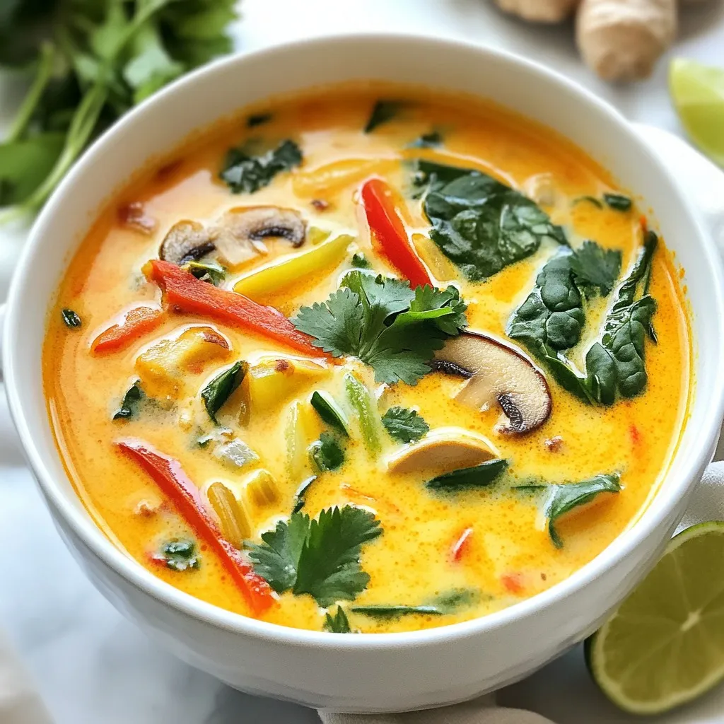 - 1 can (14 oz) coconut milk - 2 cups vegetable broth - 1 tablespoon red curry paste - 1 (1-inch) piece of ginger, sliced - 2 stalks of lemongrass, trimmed and smashed - 1 cup shiitake mushrooms, sliced - 1 red bell pepper, thinly sliced - 1 cup baby spinach - 2 tablespoons soy sauce - 1 tablespoon lime juice - 1 tablespoon brown sugar - 1-2 Thai bird's eye chilies (adjust to spice preference) - Fresh cilantro, chopped (for garnish) - Lime wedges (for serving) These ingredients create a rich and creamy base for the soup. The coconut milk gives it a smooth texture. The vegetable broth adds depth. Red curry paste brings heat and flavor. Fresh veggies add crunch and color. You can swap in different proteins or vegetables. Chicken or tofu works well in this soup. Use any fresh veggies you have on hand. For a dairy-free option, stick to coconut milk. - Large pot - Chef’s knife - Cutting board These tools help you prep and cook efficiently. A large pot holds all the ingredients. A sharp chef's knife cuts veggies with ease. A cutting board keeps your workspace clean and safe. {{ingredient_image_1}} In a large pot, pour in the coconut milk and vegetable broth. Stir them together over medium heat. Make sure they mix well. Next, add the red curry paste, sliced ginger, and smashed lemongrass. Stir this mixture to blend all the flavors. Watch as it begins to simmer gently, filling your kitchen with a lovely aroma. Once the base is simmering, it’s time to add the vegetables. Toss in the sliced shiitake mushrooms and the thinly sliced red bell pepper. Don’t forget the Thai bird's eye chilies for heat! Let the soup simmer for about 5 to 7 minutes. This step helps the veggies become tender and soak up all those vibrant flavors. After the vegetables have cooked, it’s time to remove the inedible parts. Take out the ginger slices and lemongrass stalks. Now, add the baby spinach to the pot. Pour in the soy sauce, lime juice, and brown sugar. Stir until the spinach wilts down. This adds a fresh taste to your soup. Taste it and adjust if needed. You can add more soy sauce or lime juice for extra flavor. To make your soup really stand out, you can enhance the spice levels. Start with one Thai bird's eye chili. If you like more heat, add another. Test the soup after letting it simmer. Adjust as needed. Balancing sweet and sour is key too. Use lime juice for tang and brown sugar for sweetness. These flavors should dance together for a perfect bite. Pre-chopping ingredients can save time. Slice your mushrooms and bell pepper ahead of time. You can also smash the lemongrass in advance. Using premade curry paste is a smart move. It saves time and still brings great flavor. Just make sure it's a high-quality brand for the best taste. Garnishing your soup is fun and easy. Add fresh cilantro on top for color and flavor. Lime wedges are a must-have on the side. They add a fresh burst when squeezed. Serve the soup in bright bowls to make it pop. This will make your dish look as great as it tastes! Pro Tips Adjusting Spice Level: If you prefer a milder soup, start with one bird's eye chili and taste before adding more. Fresh Ingredients: Use fresh lemongrass and ginger for the best flavor; dried substitutes won't deliver the same aroma. Serving Suggestions: Pair the soup with jasmine rice or rice noodles for a heartier meal. Storage Tips: Store leftovers in an airtight container in the fridge for up to 3 days; reheat gently to avoid curdling the coconut milk. {{image_2}} You can easily change the Spicy Thai Coconut Soup to suit your taste. - Spicy Thai Coconut Soup with Chicken: Add cooked chicken for extra protein. Use shredded rotisserie chicken or poach chicken breasts in the broth. This makes the soup heartier and very satisfying. - Vegan adaptations: Swap chicken with tofu or tempeh. You can also add more vegetables like carrots or zucchini for extra texture. This keeps the soup rich and creamy while staying plant-based. Mixing in different herbs and spices can give your soup a new twist. - Adding different herbs and spices: Try fresh basil or mint for a fresh flavor. You can also add cumin or coriander for a warm touch. These additions bring a new depth to the dish. - Fusion variations (e.g., Thai-Mexican): Combine Thai and Mexican flavors by adding corn and black beans. You can also use chipotle peppers for a smoky kick. This fusion creates a unique and exciting flavor profile. Using seasonal ingredients can enhance your soup's taste and freshness. - Adapting the recipe based on seasonal vegetables: In fall, add butternut squash or sweet potatoes. In summer, use fresh corn or bell peppers. Seasonal veggies bring color and nutrition. - Utilizing leftover ingredients: If you have leftover veggies in the fridge, throw them in! Broccoli, snap peas, or even spinach works well. This not only cuts waste but also enhances the soup's flavor. To keep your spicy Thai coconut soup fresh, follow these tips: - Refrigeration: Store the soup in an airtight container. It can last up to four days in the fridge. - Freezing: For longer storage, freeze the soup in a freezer-safe container. Leave some space at the top for expansion. - Best containers: Use glass or BPA-free plastic containers. They seal tightly and prevent leaks. When you're ready to enjoy your soup again, use these methods: - Best methods: Reheat in a pot over medium heat. Stir frequently to prevent sticking. You can also use a microwave in short bursts. - Cooking from frozen: If frozen, thaw it overnight in the fridge. You can also heat it directly from frozen. Just add a splash of broth and heat gently. Knowing how long the soup lasts helps you avoid waste: - How long: In the fridge, it lasts about four days. In the freezer, it can last up to three months. - Signs of expiration: Look for changes in smell or color. If it smells off or looks strange, it's best to toss it. What makes a dish 'Thai'? A dish is 'Thai' when it uses specific ingredients and flavors. 