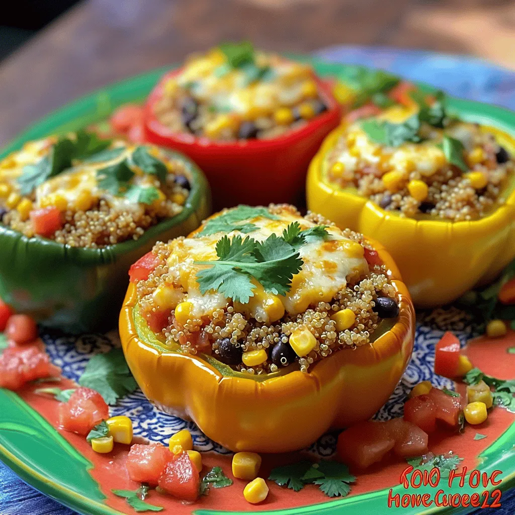 For the perfect stuffed bell peppers, gather these fresh ingredients: - 4 medium bell peppers (any color) - 1 cup quinoa, rinsed - 2 cups vegetable broth - 1 can (15 oz) black beans, rinsed and drained - 1 cup corn kernels (fresh or frozen) - 1 medium onion, diced - 2 cloves garlic, minced - 1 teaspoon cumin - 1 teaspoon smoked paprika - 1 teaspoon chili powder - Salt and pepper to taste - 1 cup diced tomatoes (fresh or canned) - 1 cup shredded cheese (cheddar or Mexican blend) - Fresh cilantro or parsley for garnish Understanding the health benefits of the ingredients helps you make better choices: - Bell Peppers: Rich in vitamins A and C, they boost your immune system and skin health. - Quinoa: This whole grain is high in protein and fiber, perfect for filling you up. - Black Beans: They offer protein and fiber, aiding digestion and heart health. - Corn: A good source of fiber and antioxidants, corn adds sweetness and color. - Cheese: Provides calcium and protein, enhancing the dish's richness. Select bell peppers like a chef with these simple tips: - Color: Choose bright, vibrant peppers. Red, yellow, and orange have more sweetness. - Firmness: Pick peppers that feel firm and heavy. Avoid any that feel soft or wrinkled. - Skin: Look for smooth skin without blemishes. This indicates freshness. - Size: Medium peppers are easier to stuff and cook evenly. These tips will help you find the best bell peppers for your stuffed delight. For the full recipe, check out the steps and enjoy cooking! To start, rinse 1 cup of quinoa under cold water. This removes any bitter taste. Then, in a medium pot, add the rinsed quinoa and 2 cups of vegetable broth. Bring it to a boil over medium heat. Once it boils, lower the heat to simmer. Cover the pot and let it cook for about 15 minutes. The quinoa is ready when it is fluffy and all the liquid is gone. Remove it from heat and let it sit for a few minutes. Next, grab 4 medium bell peppers. You can choose any color you like. Cut the tops off and carefully remove the seeds and membranes. This helps the filling fit nicely inside. Place the bell peppers upright in a baking dish. Make sure they stand well to hold the filling. Now, heat a large skillet over medium heat. Add a bit of olive oil and sauté 1 diced onion for about 5 minutes until it’s soft. Then, add 2 minced garlic cloves and cook for another minute. Mix in the cooked quinoa, 1 can of rinsed black beans, 1 cup of corn, and 1 cup of diced tomatoes. Add 1 teaspoon of cumin, smoked paprika, and chili powder. Season it all with salt and pepper. Stir until everything is heated through. Stuff the bell peppers with this tasty mixture. If you want, sprinkle 1 cup of shredded cheese on top of each pepper. Cover the baking dish with aluminum foil and bake it in a preheated oven at 375°F (190°C) for 25 minutes. After that, take off the foil and bake for another 10-15 minutes. The peppers will be soft, and the cheese will be melted and golden. Once done, take them out and garnish with fresh cilantro or parsley. Enjoy your colorful quinoa stuffed bell peppers! To ensure your stuffed peppers cook evenly, here are some useful tips: - Cut the tops evenly: When cutting the tops off your peppers, aim for a straight cut. This helps them stand straight in the dish. - Pre-cook the filling: Cooking your filling before stuffing helps it blend better. Flavors mix, and it heats up evenly. - Don’t overfill: Stuff them well but leave some space. This allows the heat to circulate. Leftovers can be tasty! Here’s how to store and reheat your stuffed peppers: - Storing: Place leftovers in an airtight container. They’ll last up to 4 days in the fridge. - Freezing: For longer storage, freeze them. Just wrap each pepper in plastic wrap and place them in a freezer bag. They can stay fresh for about 3 months. - Reheating: To reheat, place in a baking dish. Cover with foil and bake at 350°F until warm. This keeps the peppers moist. Making your dish look great adds to the fun! Here are some ideas: - Colorful Platter: Arrange the stuffed peppers on a nice platter. Use fresh herbs as a garnish. - Extra Toppings: Drizzle some diced tomatoes or avocado around the peppers for color. - Serve with a Side: Pair them with a salad or rice for a full meal. This adds variety to your plate. For the full recipe, check out the detailed instructions provided above. Enjoy your cooking! {{image_2}} You can make stuffed bell peppers without meat. Use hearty veggies and grains. Try adding mushrooms, spinach, or zucchini. These options pack in flavor and nutrients. You can also swap quinoa for brown rice or farro. They all add great texture and taste. If you want a low-carb meal, try cauliflower rice. It’s a great substitute for grains. Just pulse cauliflower in a food processor until it’s rice-sized. Mix it with your favorite veggies and spices. This will give you a tasty filling without extra carbs. You can also use ground turkey or chicken for a lighter option. Experiment with different fillings to keep things exciting. You can use lentils or chickpeas for added protein. Add herbs like basil or oregano for a fresh twist. Feel free to mix in cheeses, like feta or goat cheese, for creaminess. Spices like curry powder or Italian seasoning can also change the flavor. The possibilities are endless, so get creative! Check out the Full Recipe for more ideas. Store your leftover stuffed bell peppers in an airtight container. This keeps them fresh. Make sure they cool down first. Place them in the fridge. They will be good for up to three days. Pack them tightly to avoid drying out. You can freeze stuffed bell peppers for later meals. Wrap each pepper in plastic wrap. Then place them in a freezer bag. Remove as much air as possible. They can last up to three months in the freezer. When ready to eat, thaw them overnight in the fridge. Then, reheat them in the oven or microwave. For the best taste and texture, eat your stuffed peppers within three 
