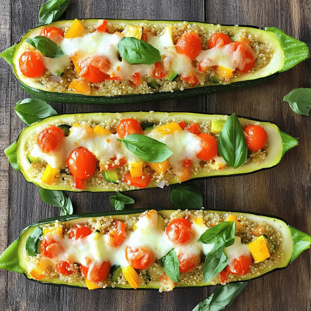 To make stuffed zucchini boats, you first need to prep the zucchini. Cut the zucchinis in half and scoop out the middle. This creates a boat shape for filling. Use the scooped-out flesh in your filling for extra flavor. Cook some onion and garlic in olive oil until soft. Then, add diced bell pepper and the chopped zucchini flesh. Stir in cooked quinoa and halved cherry tomatoes. Season with dried oregano, paprika, salt, and pepper. Mix in half the mozzarella cheese. Fill each zucchini half with this mixture. Top with the rest of the cheese, then bake until tender and bubbly.