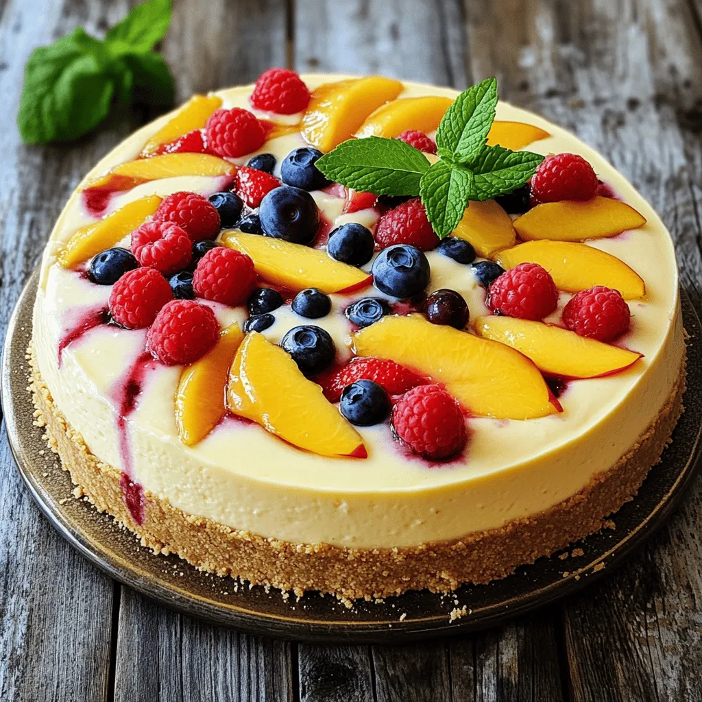 To make a great Summer Berry Peach Cheesecake, you need fresh and simple ingredients. The graham cracker crumbs form the crust. The melted butter binds everything together. Sugar sweetens the crust and filling. Cream cheese gives the cheesecake its rich taste and texture. Eggs help set the filling. Vanilla extract adds depth. Sour cream adds creaminess and a slight tang. Fresh peaches and mixed berries bring a burst of flavor and color. Lemon juice brightens the fruit and balances sweetness. You can garnish with fresh mint leaves for a nice touch.