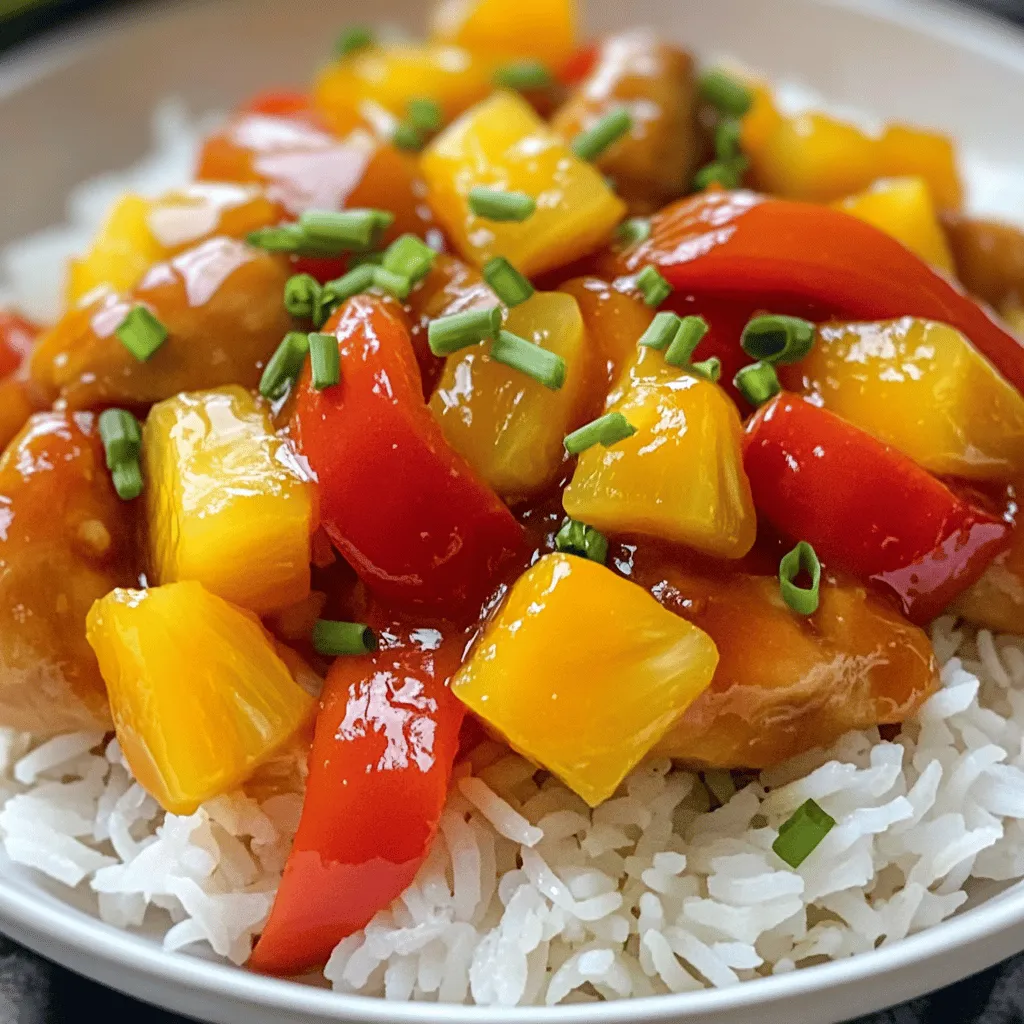 Now it’s time to bring it all together. First, mix 2 tablespoons of cornstarch with 1/4 cup of water in a small bowl until smooth. Add this to your earlier sauce mixture. Pour the sauce over the chicken and veggies in the skillet. Bring it to a gentle simmer and cook for an additional 3-5 minutes. This will help the sauce thicken up nicely. Finally, fold in 1 cup of pineapple chunks and cook for another 2 minutes until heated through. Serve your sweet and sour chicken hot over cooked rice or quinoa. Enjoy the vibrant flavors!