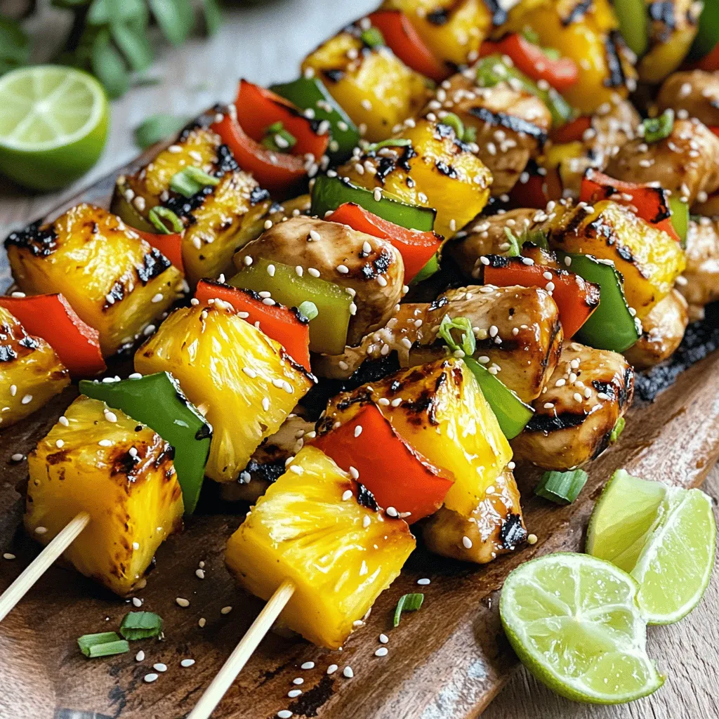 To make Teriyaki Chicken Pineapple Skewers, start with the marinade. Mix soy sauce, honey, rice vinegar, ginger, garlic, and sesame oil in a bowl. Next, cut your chicken, pineapple, bell pepper, and onion into one-inch pieces. Add the chicken to the marinade and let it sit for at least 30 minutes. Thread the chicken and veggies onto skewers. Grill the skewers for about 12-15 minutes, turning often, until the chicken reaches 165°F. Brush with more marinade for extra flavor.