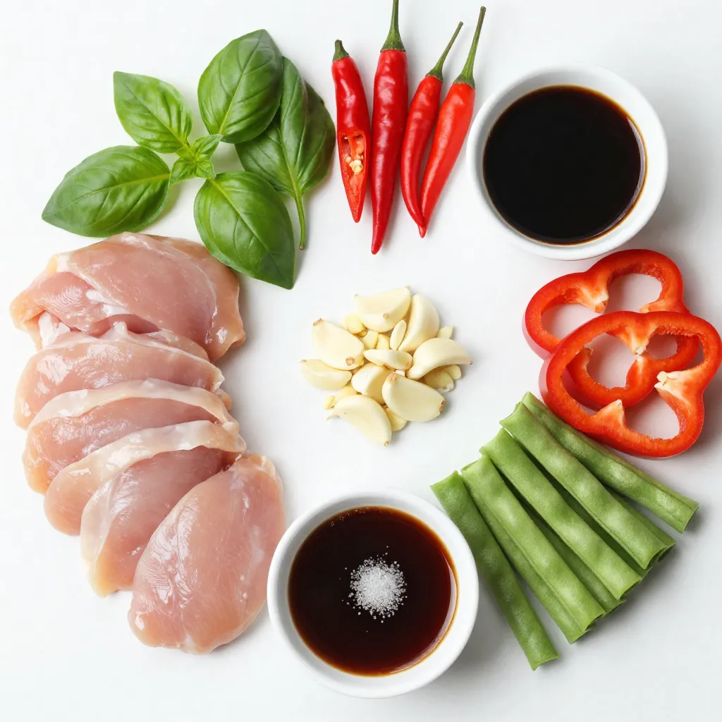 When I whip up Thai basil chicken stir-fry, I start with the main ingredients. The chicken thighs bring juiciness and flavor. I slice them thinly for quick cooking. Garlic adds a strong aroma, while Thai bird’s eye chilies bring heat. You can adjust the number based on your spice level.