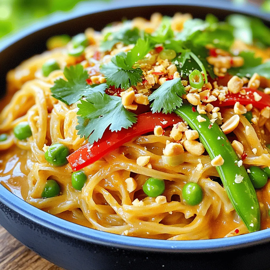 - 8 oz rice noodles - 1/2 cup creamy peanut butter - 2 tablespoons soy sauce - 1 tablespoon lime juice - 2 tablespoons honey or maple syrup - 1 tablespoon sesame oil - 2 teaspoons grated fresh ginger - 1 red bell pepper, thinly sliced - 1 cup snap peas, trimmed - 1 cup shredded carrots - 1/4 cup chopped green onions - 1/4 cup crushed peanuts for garnish - Fresh cilantro leaves for garnish (optional) - Crushed red pepper flakes (to taste) I love how simple and quick this recipe is. You only need a few key ingredients to make a big impact. Rice noodles form the base of this dish, giving it a nice, chewy texture. Creamy peanut butter adds a rich flavor that makes every bite satisfying. Soy sauce brings umami, while lime juice adds a zesty kick. For a hint of sweetness, honey or maple syrup works wonders. Don't forget sesame oil for a nutty aroma and fresh ginger for a bright, spicy touch. The colorful veggies—red bell pepper, snap peas, and shredded carrots—boost flavor and nutrition. They also make the dish look vibrant and appealing. Top it off with green onions and crushed peanuts for crunch. If you want an extra layer of flavor, fresh cilantro is a nice touch. You can also add crushed red pepper flakes to adjust the heat to your liking. Check out the Full Recipe for details on how to bring all these flavors together! Start by boiling a large pot of water. Add 8 oz of rice noodles to the boiling water. Cook them as the package says, usually for 7 to 10 minutes. You want them to be al dente. Once done, drain the noodles and rinse them under cold water. This stops the cooking and keeps them firm. In a medium bowl, combine 1/2 cup of creamy peanut butter, 2 tablespoons of soy sauce, and 1 tablespoon of lime juice. Add 2 tablespoons of honey or maple syrup, 1 tablespoon of sesame oil, and 2 teaspoons of grated fresh ginger. Whisk everything together until smooth. If the sauce is thick, you can add a bit of warm water to get it just right. Grab a large skillet or wok and heat 1 tablespoon of sesame oil over medium heat. Once hot, toss in the sliced red bell pepper, trimmed snap peas, and shredded carrots. Sauté these for about 3 to 4 minutes. You want the veggies to be tender but still crisp. Add the cooked rice noodles to the skillet with your sautéed veggies. Pour the peanut sauce over the noodles. Gently toss everything together until the noodles are coated in sauce. Heat it through for about 2 to 3 minutes. Remove the pan from heat. Transfer the noodles to serving plates. Top with 1/4 cup of chopped green onions and 1/4 cup of crushed peanuts. You can add fresh cilantro leaves if you like. For a spicy kick, sprinkle crushed red pepper flakes on top. For the full recipe, check out the detailed instructions above. To get the right sauce, you may need to adjust its thickness. If it feels too thick, add warm water slowly. Stir until you reach a smooth consistency. If you want a bolder taste, try adding more soy sauce or lime juice. For a twist, mix in some sriracha for heat or coconut milk for creaminess. You can also swap peanut butter for almond or sunflower seed butter if you are allergic. When cooking rice noodles, always boil plenty of water. It helps prevent sticking. Cook them just until tender, usually 7-10 minutes. After draining, rinse them with cold water. This stops the cooking process and keeps them from getting mushy. For your veggies, cut them into similar sizes. This helps them cook evenly. Stir-frying in a hot pan keeps them crisp and colorful. If you have leftovers, store them in an airtight container. They will stay fresh in the fridge for about three days. For reheating, use a skillet over medium heat. Add a splash of water to help steam the ingredients. You can also microwave them for a quick meal, but add a little water to keep them moist. Enjoy your Thai peanut noodles any time! {{image_2}} You can easily boost your Thai peanut noodles with protein. Here are some tasty options: - Chicken: Cut chicken breast into thin strips. Sauté until golden brown. Add it to your noodles for a hearty meal. - Tofu: Firm tofu works great. Cube it and pan-fry until crispy. This adds a nice texture. - Shrimp: Peel and devein shrimp. Cook them in a pan until they turn pink. They pair perfectly with the peanut sauce. Adding protein not only enriches the dish but also makes it more filling. To make your noodles shine, try these flavor boosts: - Fresh lime zest: Grate some lime peel and sprinkle it on top. This adds a fresh burst of flavor. - Chili paste: Stir in a spoonful of chili paste. This brings heat and depth to your dish. Adjust to your taste! These small changes can elevate your meal from good to great. Making this dish fit your diet is easy. Here are some swaps: - Vegan: Use maple syrup instead of honey. This keeps the dish sweet while staying plant-based. - Gluten-free: Choose gluten-free soy sauce. This keeps the flavor without the gluten. - Rice noodles: They are naturally gluten-free. Just ensure they are labeled as such. These simple swaps help everyone enjoy Thai peanut noodles, regardless of dietary needs. For the full recipe, check out the instructions provided. To keep your Thai peanut noodles fresh, refrigerate them right away. Place the noodles in an airtight container. Make sure to separate the sauce from the noodles if possible. This can help keep the noodles from getting mushy. When stored properly, leftovers can last for about three to four days in the fridge. Before serving, just reheat them in the microwave or on the stove. You can also freeze Thai peanut noodles. Start by letting them cool completely. Then, put them in freezer-safe bags or containers. Remove as much air as you can to prevent freezer burn. They can stay fresh for up to three months in the freezer. When you're ready to eat, defrost them in the fridge overnight. Reheat gently on the stove, adding a splash of water if needed. To keep your noodles fresh for longer, store them in a cool, dry place