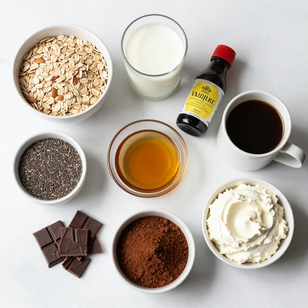 To make Tiramisu Overnight Oats, you need simple ingredients. Rolled oats form the base, giving you a hearty texture. Almond milk or any milk you prefer makes it creamy. Chia seeds help thicken the mix and add good nutrients. Sweeten it with maple syrup or honey for a touch of sweetness.