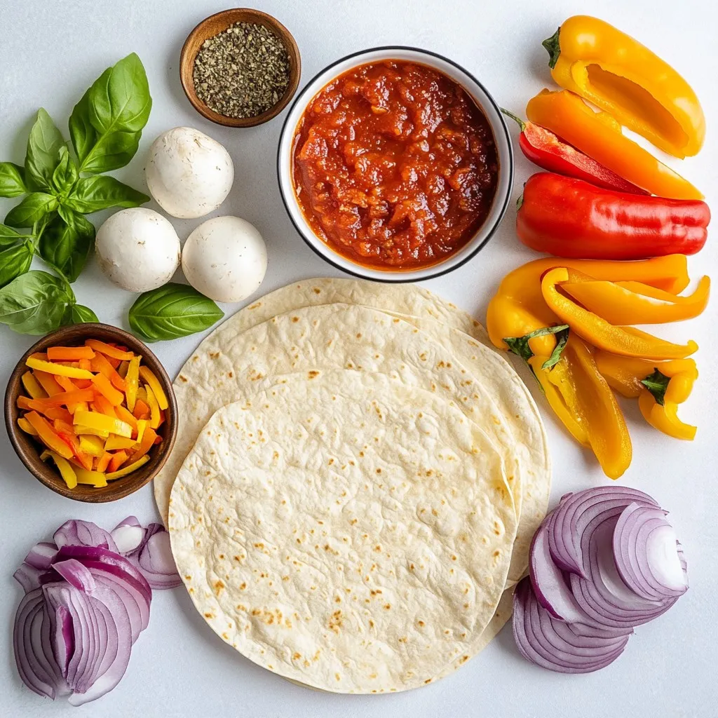 To make your tortilla pizza, gather these fresh ingredients first. The large flour tortillas serve as the base. Marinara sauce brings rich flavor. Shredded mozzarella cheese melts beautifully and adds creaminess.