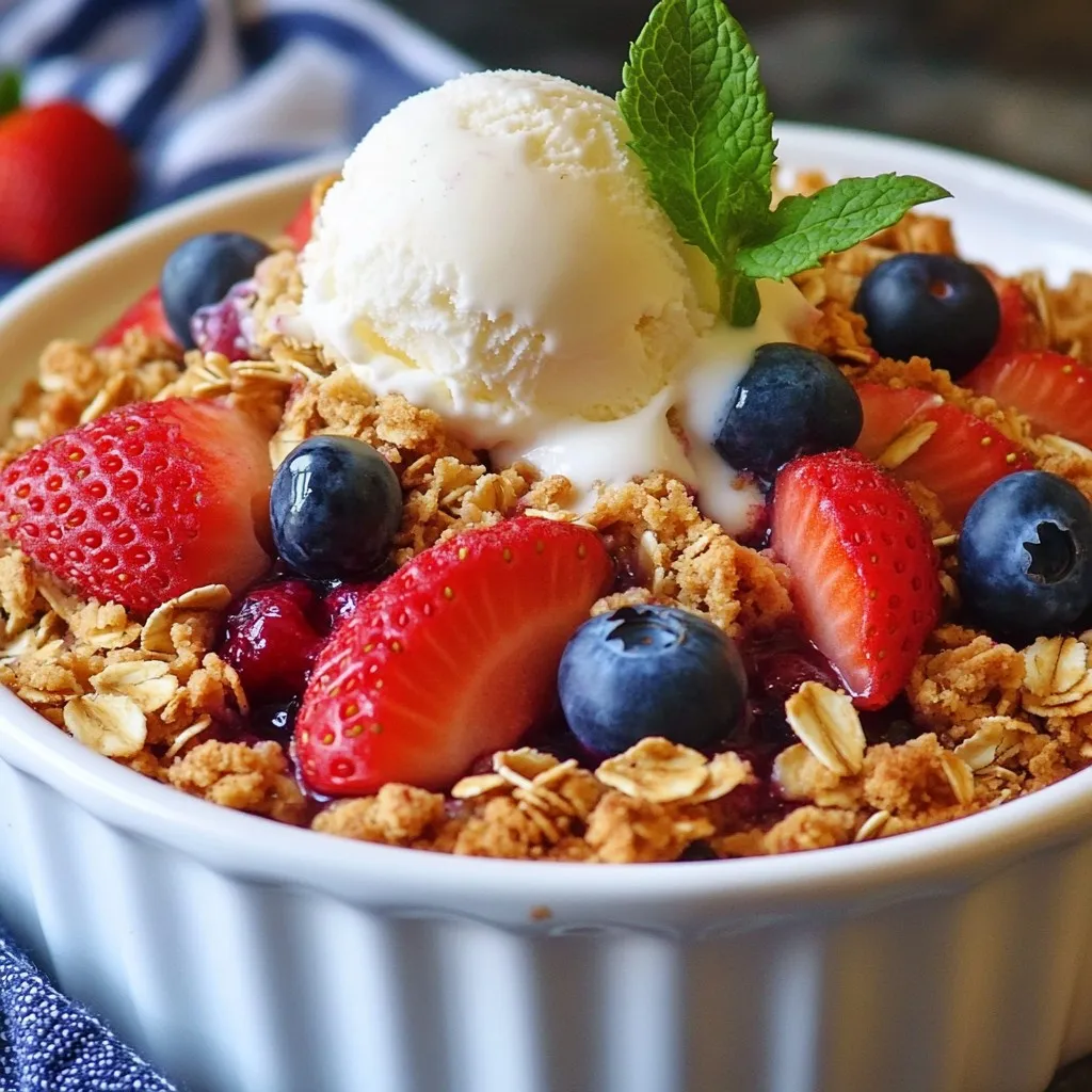 A delightful dessert featuring a mix of strawberries, blueberries, and raspberries topped with a crispy oat mixture.