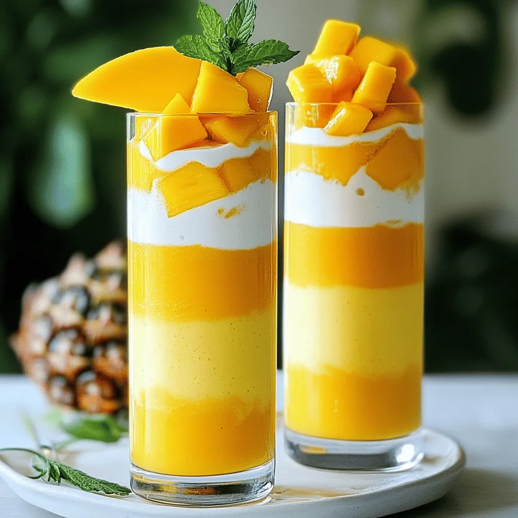 ![For the best Tropical Mango Pineapple Smoothie, gather these key ingredients: - 1 ripe mango, peeled and diced - 1 cup fresh pineapple chunks - 1 banana, peeled - 1 cup coconut milk - 1/2 cup Greek yogurt - 1 tablespoon honey or agave syrup (optional) - 1/2 teaspoon grated fresh ginger - 1 cup ice cubes Each ingredient adds a special touch. The mango gives sweetness and a smooth texture. Pineapple brings brightness and a tropical flair. The banana adds creaminess and makes it filling. Coconut milk makes it rich and tropical. Greek yogurt boosts protein and adds creaminess. Ginger offers a zing that wakes up your taste buds. You can sweeten it with honey or agave syrup if you like. And don’t forget the ice; it keeps your smoothie cold and refreshing. For the full recipe, be sure to check out the instructions after this section! Making a Tropical Mango Pineapple Smoothie is easy and fun! Follow these simple steps to create a refreshing drink that bursts with flavor. 1. Combine fresh fruits in a blender Start by adding the ripe mango, fresh pineapple chunks, and banana into your blender. Make sure to peel and chop the fruits for a smooth blend. 2. Add coconut milk and Greek yogurt Next, pour in the coconut milk and scoop in the Greek yogurt. This will give your smoothie a creamy texture. 3. Sweeten with honey or agave syrup If you prefer a sweeter drink, add honey or agave syrup. Just one tablespoon should do. You can always taste it later to see if you want more. 4. Incorporate grated ginger For a zesty kick, add the grated ginger. This spice adds warmth and a hint of spice to your smoothie. 5. Add ice and blend until smooth Toss in the ice cubes to make your smoothie cold and refreshing. Blend on high speed until everything is smooth and creamy. 6. Taste and adjust sweetness if necessary Once blended, taste your smoothie. If it needs more sweetness, add a bit more honey or agave, and blend again briefly. 7. Serve and enjoy! Pour your smoothie into tall glasses. You can garnish with a slice of fresh mango and a sprig of mint for a lovely finish. Enjoy your Tropical Mango Pineapple Smoothie! These steps will guide you to a delicious drink in just about 10 minutes. For the complete recipe, check the [Full Recipe]. Choosing the right mango and pineapple is key. A ripe mango should feel slightly soft when you press it. It should smell sweet at the stem end. For pineapple, look for a sweet smell and a golden color. The fruit should have some give when squeezed gently. To achieve the right consistency and thickness, balance is vital. Use coconut milk for creaminess and Greek yogurt for a thicker texture. Adjust the amount of coconut milk to get your desired thickness. You may want it thin for sipping or thick for a spoonable treat. Using frozen fruit can add extra coldness. Frozen mango or pineapple keeps your smoothie icy and refreshing. If you use fresh fruit, add more ice cubes to chill it down. This step is great for hot days when you want a cool drink. Experimenting with ingredient ratios can lead to new flavors. You can start with the basic recipe and adjust it to your taste. Add more mango for sweetness or more ginger for zing. Do not hesitate to try different fruits or liquids. Each tweak can make your tropical smoothie unique and fun. For the full recipe, check the section above. Enjoy blending! {{image_2}} You can make your Tropical Mango Pineapple Smoothie even more fun with a few easy tweaks. Here are some great ideas: - Adding spinach or kale for a green boost: Tossing in some spinach or kale adds vibrant color and nutrients. You won't taste them much, but your smoothie gets a healthy kick. - Using different non-dairy milk options: If you want to change things up, try almond, oat, or soy milk. Each milk brings a unique flavor and texture to your drink. - Incorporating other fruits like papaya or passion fruit: You can mix in papaya or passion fruit for extra tropical flair. These fruits add new tastes and make the smoothie even more exciting. - Creating a protein-packed version with protein powder: For a protein boost, add some protein powder. This makes the smoothie great for a post-workout treat or a filling breakfast. These variations keep your Tropical Mango Pineapple Smoothie fresh and fun! For the full recipe, follow the detailed steps above. You might have some smoothie left after making your Tropical Mango Pineapple Smoothie. To keep it fresh, store it in a glass jar or airtight container. Try to leave some space at the top. This way, the smoothie doesn't expand and spill. It will stay good in the fridge for up to 24 hours. If you want to save it for a longer time, freeze your smoothie. Pour it into ice cube trays or freezer bags. This method helps you make single servings later. When you're ready to enjoy, just blend the frozen cubes with a little coconut milk or water. Sometimes, you may find a smoothie that has sat in the fridge. It might separate a bit. No worries! Just give it a quick shake or stir. You can also blend it again for a smooth texture. Enjoying your smoothie later is just as good as when you first made it! Can I make this smoothie ahead of time? Yes, you can make this smoothie ahead of time. Blend your ingredients and store them in the fridge for up to 24 hours. Just remember to shake or stir it well before serving. What is the best way to blend a smoothie? To blend a smoothie well, add liquids first. This helps the blades move freely. Next, add soft fruits, then hard ones like ice. Blend on high until smooth. Stop to scrape the sides if needed. How can I make it vegan-friendly? To make this smoothie vegan, simply replace Greek yogurt with a plant-based yogurt. Also, use agave syrup instead of honey. Coconut milk is already vegan, so you are good there! Can I add supplements like protein or fiber? Yes, you can add protein powder or fiber to your smoothie. Just mix in a scoop of your favorite protein powder or a tablespoon of chia seeds. This boosts nutr