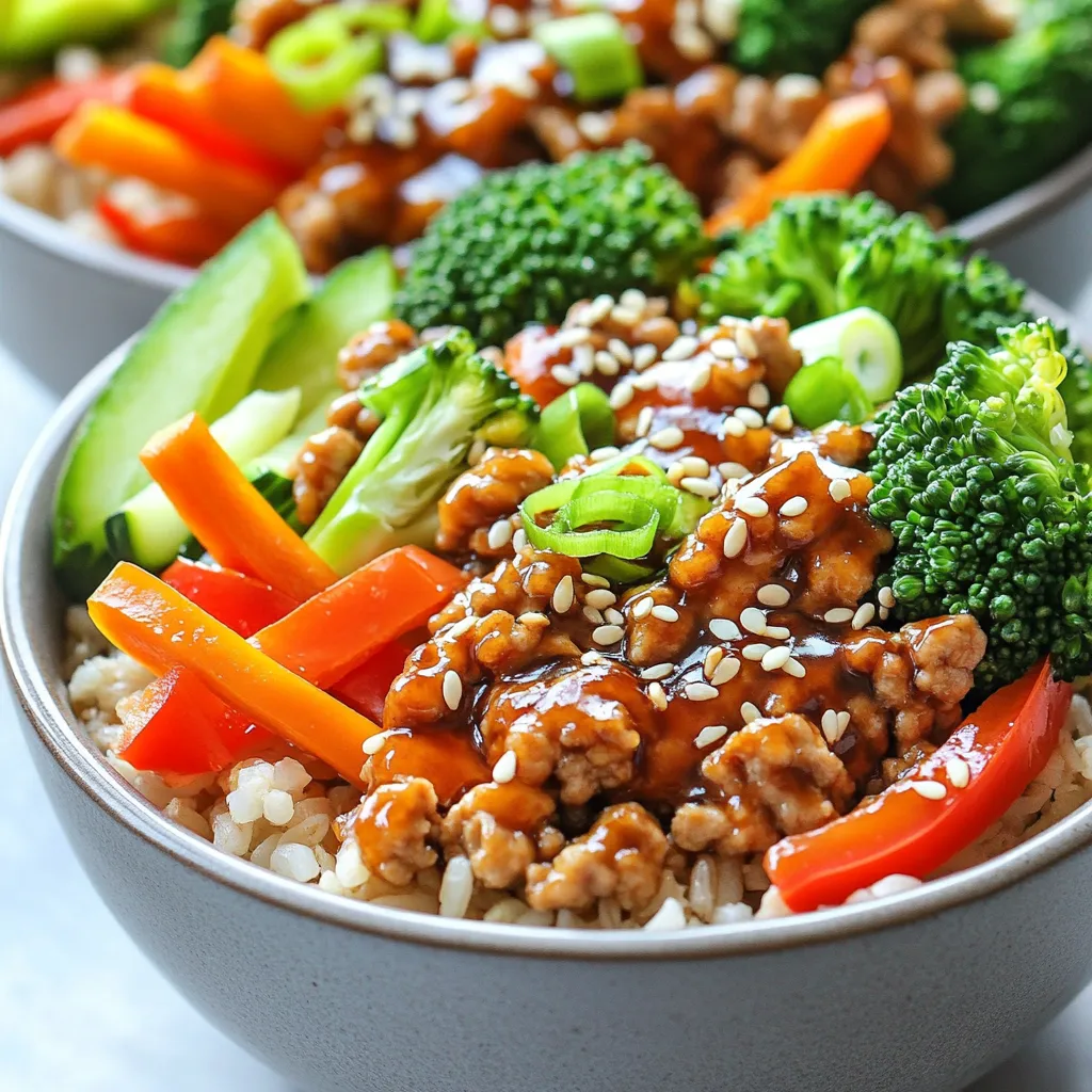 - 1 lb ground turkey - 1/4 cup low-sodium soy sauce - 2 cups broccoli florets - 1 red bell pepper, sliced - 1 carrot, julienned For this dish, ground turkey is your star. It cooks quickly and absorbs flavors well. I love using low-sodium soy sauce. It gives the dish a rich taste without too much salt. Fresh vegetables add color and crunch. Broccoli, red bell pepper, and carrot are my favorites. They cook fast and add nutrients. - 2 tablespoons honey - 1 tablespoon rice vinegar - 1 tablespoon sesame oil Honey adds a bit of sweetness to balance the saltiness of soy sauce. Rice vinegar gives a nice tang. Sesame oil adds a rich, nutty flavor. These three ingredients make the teriyaki sauce special. - Sesame seeds - Green onions Garnishes take your meal to the next level. Sesame seeds add a slight crunch. Green onions bring freshness and color. These toppings make the meal look pretty and taste even better. {{ingredient_image_1}} 1. In a large bowl, mix together the low-sodium soy sauce, honey, and rice vinegar. This will form the base of our teriyaki sauce. 2. Next, add the minced garlic and grated ginger to the bowl. Both ingredients add great flavor and aroma to the sauce. 3. Stir everything until well combined. Set the teriyaki sauce aside for later use. 1. In a skillet over medium heat, add the ground turkey. Cook it until it turns brown and is fully done, which takes about 5-7 minutes. 2. If there's excess fat, drain it off to keep the dish lighter. 3. Pour the teriyaki sauce over the cooked turkey. Stir it well and let it simmer for 2-3 minutes. This helps the turkey absorb all the tasty flavors. 1. For the veggies, you can steam the broccoli florets, sliced bell pepper, and julienned carrot. You can use a pot or microwave for this. 2. Steam them until they are tender but still crisp, which usually takes about 3-5 minutes. This keeps the vegetables fresh and bright in color. 1. Start by adding a scoop of cooked brown rice to your meal prep container. This forms the base of your bowl. 2. Next, top the rice with the teriyaki turkey. Make sure to cover a good portion of the rice. 3. Add a generous amount of the steamed vegetables on the side. 4. For a nice touch, garnish each bowl with a sprinkle of sesame seeds and sliced green onions. This enhances both flavor and appearance. 5. Let the bowls cool before sealing them. Then store them in the refrigerator for your meal prep. To keep your turkey juicy, do not overcook it. Ground turkey cooks fast, so check it often. When you brown the turkey, aim for a nice golden color. This way, it keeps flavor locked in. After cooking, drain any excess fat. This step helps the sauce stick better. For sauce thickness, simmer it a bit longer after adding it to the turkey. This lets it coat the meat nicely. If you like a thicker sauce, cook it for a few extra minutes. You can also add a cornstarch slurry for quick thickening. Mix one tablespoon of cornstarch with two tablespoons of water, then stir it in. When prepping meals, keep it simple and organized. Start by cooking all your ingredients first. This includes the turkey and veggies. Once done, divide everything into containers. Use glass or BPA-free plastic containers for storage. They help keep the food fresh. Look for containers with tight lids to prevent spills. Label each container with the date. This helps you track freshness. It’s best to eat your meal prep bowls within four days. If you want to store them longer, consider freezing some portions. Want to spice things up? You can add red pepper flakes or Sriracha for heat. A splash of lime juice gives a fresh taste too. Try adding a dash of five-spice powder for depth. Incorporating other vegetables makes your bowls colorful and healthy. Snap peas, zucchini, or green beans work great. Just steam them slightly before adding. This keeps them crisp and vibrant. Pro Tips Use Fresh Ingredients: Fresh vegetables and herbs will enhance the flavor and nutritional value of your meal prep bowls. Always choose seasonal produce for the best taste. Customize Your Veggies: Feel free to swap out the vegetables based on your preference or what you have on hand. Snow peas, zucchini, or snap peas would also work well in this recipe. Make Extra Sauce: If you love the teriyaki sauce, consider making a double batch. You can use it for other dishes throughout the week, adding a delicious flavor boost. Meal Prep Storage: Use airtight containers to keep your meal prep bowls fresh for longer. Glass containers are ideal as they are microwave-safe and help maintain the quality of your food. {{image_2}} You can swap out ground turkey for chicken or tofu. Chicken has a mild taste and cooks quickly. It works well with the teriyaki sauce. Use boneless chicken thighs for a juicy option. If you want to go plant-based, tofu is a great choice. Firm tofu holds its shape well when cooked. Just press it first to remove excess water. For a vegetarian twist, try tempeh or seitan. Both absorb flavors nicely and add protein to your meal. You can change up the grains in your meal prep bowls. Instead of brown rice, consider quinoa. Quinoa is a protein-rich grain and cooks quickly. Jasmine rice is another option for a fragrant touch. It has a soft texture and pairs well with teriyaki. For a low-carb choice, try cauliflower rice. It cooks fast and adds a nice crunch. Play with the flavors of your teriyaki sauce! You can make a sweet and sour version by adding pineapple juice. This adds a fruity taste that brightens up the dish. For those who love heat, add red pepper flakes or sriracha. This gives a spicy kick that balances the sweetness of the sauce. Experimenting with these variations keeps your meals exciting and fresh. How long will it last in the fridge? Turkey teriyaki meal prep bowls can last in the fridge for up to four days. Store them in airtight containers to keep them fresh. Best practices for reheating When reheating, take the bowls out of the fridge. Remove any garnishes like 